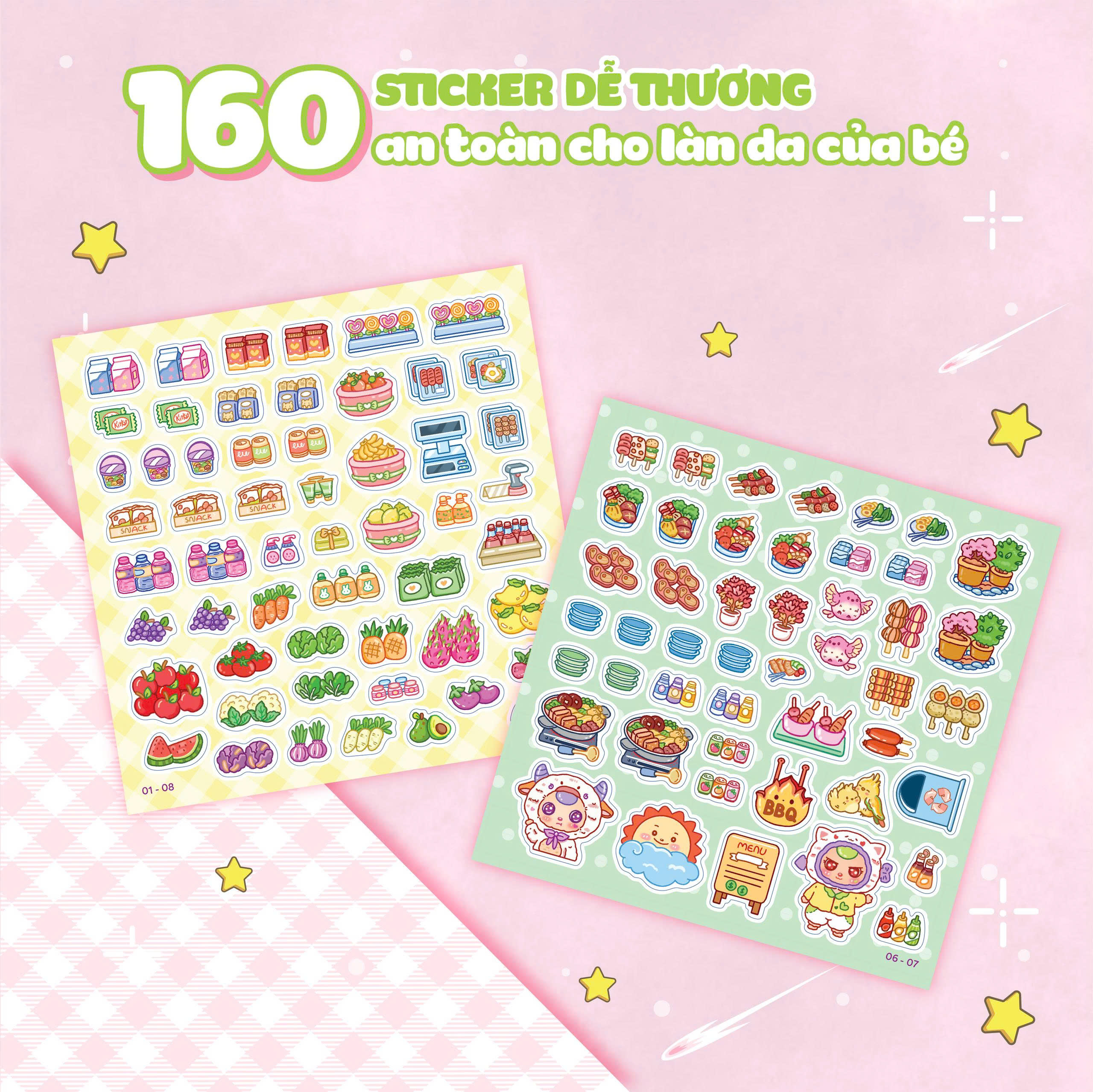 Hơn 160 sticker dễ thương, nhiều màu sắc, giúp bé phát triển khả năng quan sát và tư duy thẩm mỹ ngay từ sớm.