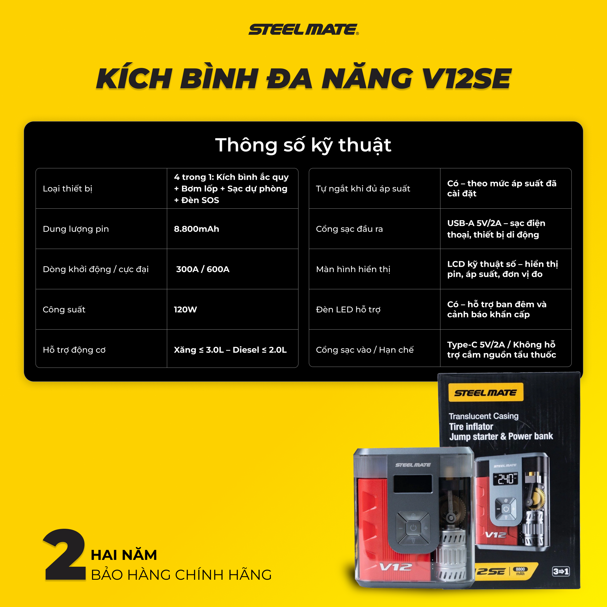 STEELMATE V12SE – GIẢI PHÁP CỨU HỘ KHẨN CẤP 3 TRONG 1 Bạn lo lắng về việc xe hết bình giữa đường, không thể khởi động? Bạn muốn có một thiết bị vừa kích bình,