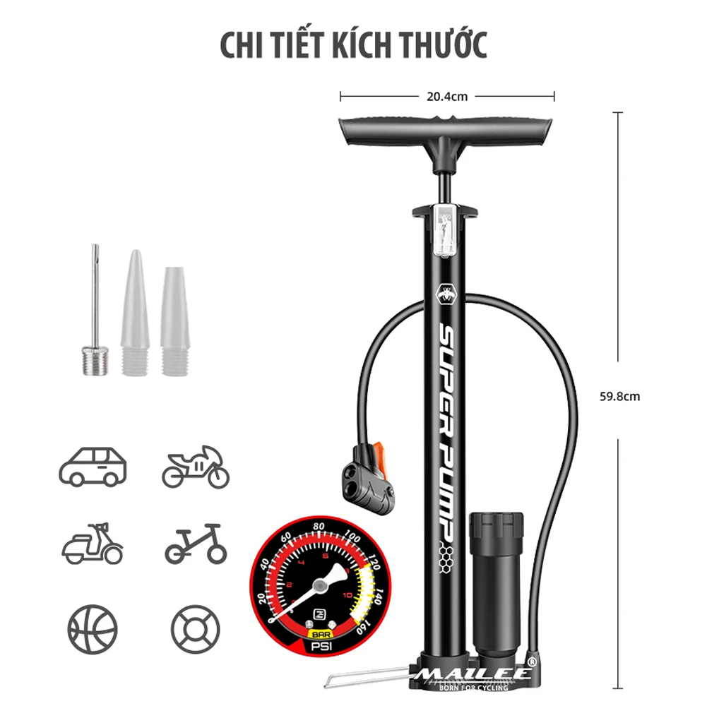 Bơm Tay Xe Đạp SP-P32 với tay cầm chống trượt, đầu bơm đa van 160PSI, Đa Dụng cho Xe Đạp, Xe máy, Xe Ô Tô, lõi nhôm bên trong, kín chống ngược khí - Mai Lee Bơm Tay SP-P32 có khả năng bơm lốp lên đến 160 PSI, giúp cho việc bơm lốp trở nên dễ dàng và thuận tiện cho nhiều loại xe đạp khác nhau. Chất Liệu Bền Bỉ: Được làm từ hợp kim chất lượng cao, bơm xe đạp này được thiết kế để chịu lực và có thể sử dụng thường xuyên mà không hỏng hóc. Bản nâng cấp có đồng hồ đo áp suất được thể hiện, giúp việc bơm đúng áp suất lốp được chính xác hơn, thay vì cảm tính như trước đây Tay cầm thiết kế công thái học, chống trơn trượt, và mỏi tay khi bơm, chất liệu nhựa ABS cứng cáp Kích thước bơm: 60 x 20.4 cm Trọng lượng: 684 gram Đầu bơm đa van, phù hợp hầu hết các loại chân bơm: van mỹ/ van pháp/ anh Sản phẩm được đi kèm 3 đầu bơm để có thể bơm bóng, bóng rổ, bóng đá, phao,...