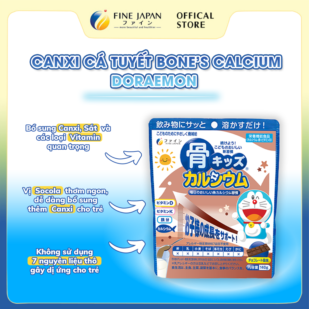 ► Bột Canxi Cá Tuyết Bone’s Calcium DORAEMON FINE JAPAN bổ sung Canxi phát triển chiều cao gói 140g Phiên bản giới hạn Canxi Cá Tuyết vị Socola – Bone’s Calcium DORAEMON Fine Bone’s Calcium đã trở lại với bao bì mới độc quyền hình ảnh Doraemon – chú mèo máy đến từ tương lai với chiếc túi thần kỳ chứa vô số bảo bối, đây cũng là tên của bộ truyện tranh Nhật Bản nổi tiếng của tác giả Fujiko F. Fujio! Phiên bản giới hạn này không chỉ hấp dẫn từ vẻ ngoài mà còn chứa đựng các dưỡng chất vàng cho sự phát triển của trẻ em. Với thiết kế Doraemon bắt mắt, đây là lựa chọn hoàn hảo giúp bé thích thú hơn khi bổ sung dưỡng chất mỗi ngày! Bone’s Calcium DORAEMON là sản phẩm Canxi hữu cơ được chiết xuất từ xương lưng cá tuyết Nhật Bản chất lượng cao. Cá tuyết được tuyển chọn kỹ càng, công nghệ chiết xuất tiên tiến tạo ra phân tử Canxi siêu nhỏ, giúp tăng tỷ lệ hấp thụ cao hơn gấp 1,35 lần so với sữa Không chỉ bổ sung Canxi mà còn bổ sung các Vitamin thiết yếu cần thiết cho quá trình hấp thu Canxi của cơ thể như Vitamin D, Vitamin B2/B6/K2.  ■ Canxi đóng vai trò quan trọng trong đối với các chức năng khác nhau trong cơ thể (phát triển cơ thể, tăng sức khỏe xương và răng, cải thiện hệ truyền dẫn thần kinh, các hoạt động cơ bắp và tế bào). Đặc biệt trẻ em đang trong thời kì phát triển. Tuy nhiên, có rất nhiều trẻ bị dị ứng với sữa bò, vốn là một thực phẩm rất giàu Canxi. Nếu lượng Canxi hấp thu không đủ thì sự phát triển bị hạn chế và mật độ xương sẽ giảm, làm tăng nguy cơ bị loãng xương. Hơn nữa, bột Canxi từ cá tuyết có tỷ lệ hấp thụ cao hơn gấp 1,35 lần so với sữa. ■ Vitamin D kết hợp cùng Canxi giúp thúc đẩy sự hấp thụ Canxi tốt hơn. Hỗ trợ xương và răng khỏe mạnh, hiệu quả trong việc ngăn ngừa bệnh còi xương và loãng xương Bone’s Calcium DORAEMON giúp hình thành thói quen ăn uống dinh dưỡng và khoa học, tốt cho sự tăng trưởng và phát triển lành mạnh của trẻ. ► KHỐI LƯỢNG TỊNH: 140g  ► THƯƠNG HIỆU: FINE JAPAN  ► XUẤT XỨ: Nhật Bản    ► ĐỐI TƯỢNG SỬ DỤNG: