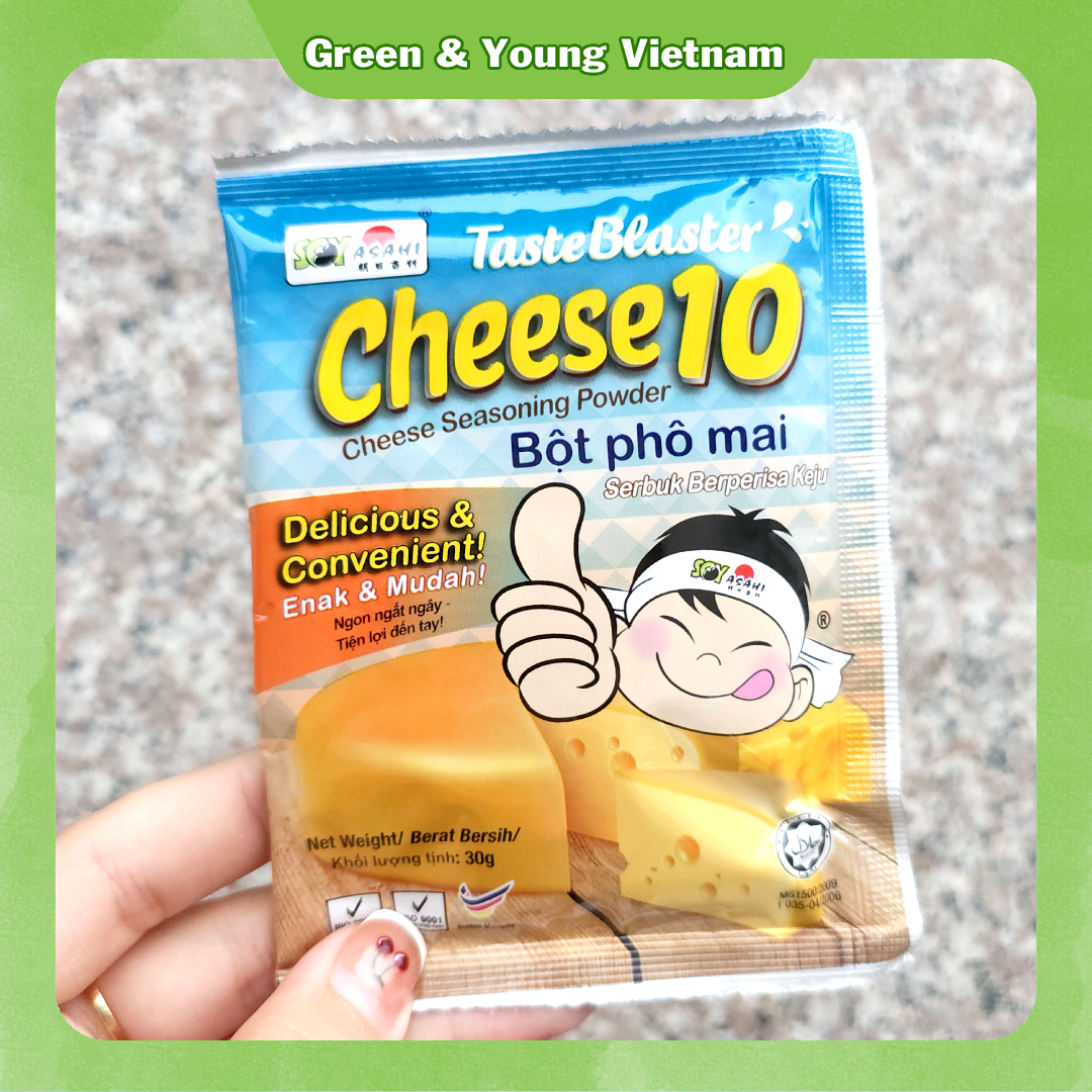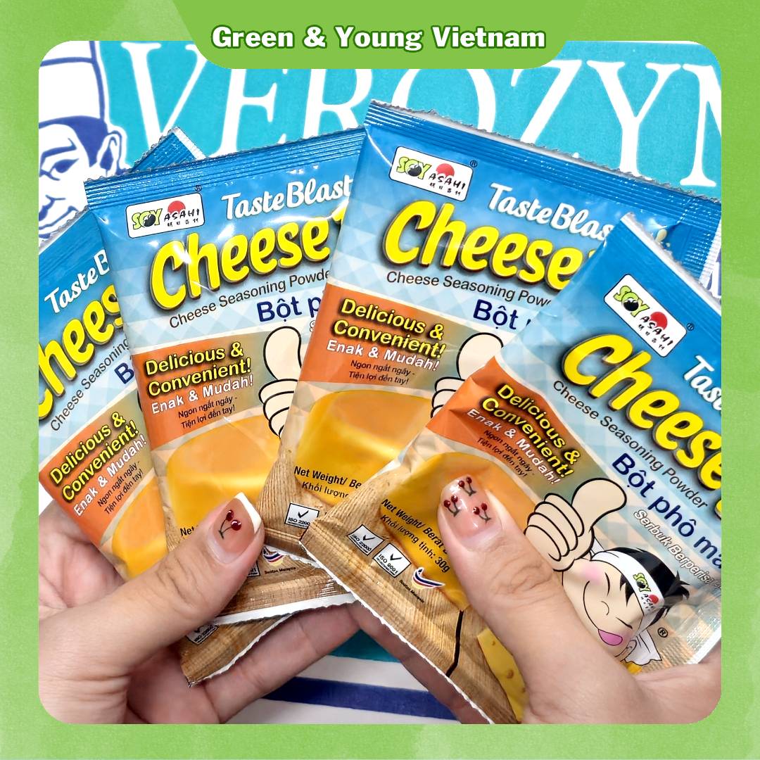 Mua tại TiktokMÔ TẢ SẢN PHẨM: Sản phẩm Bột Phô Mai Cam Malaysia Taste Blaster Cheeese 10 - 30g - thương hiệu Soy Asahi là dạng túi nhỏ của bột phô mai lắc VEROZYM nổi tiếng trên thị trường. Sản phẩm có màu cam bắt mắt, hương thơm hấp dẫn, vị mặn, ngọt, béo hài hòa phù hợp dùng trực tiếp trên nhiều món ăn: khoai tây lắc, khoai lang lắc, gà viên lắc, bánh tráng lắc, nui chiên, bánh gạo chiên, bánh phồng tôm chiên,... Ngoài dùng trực tiếp, sản phẩm còn có thể dùng làm nguyên liệu pha chế trà sữa phô mai, topping phô mai mặn,... Xuất xứ: Malaysia Khối lượng tịnh: 30 gram/1 gói - 18 gói/1 hộp Hạn sử dụng: 24 tháng
