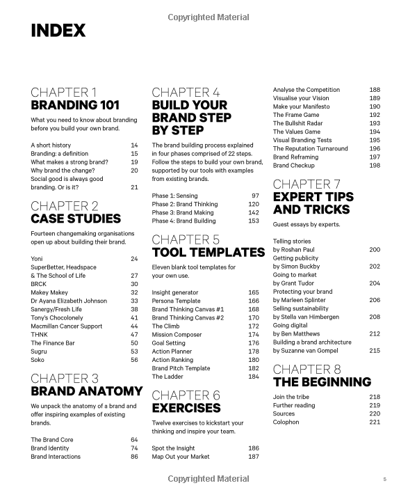 Brand the Change unpacks the brand building process in practical steps. Whether you are building an innovative new product, creating a service for good, spreading a new idea, or positioning yourself as a leader in your field, thinking like a brand strategist will help you to create a clear, compelling offer, develop unique brand experiences and ultimately attract and convert the right audiences. The book offers the tools and exercises to build your own brand and offers a rich array of tips from trademarking to digital marketing, and inspires with case studies of successful change-making brands.