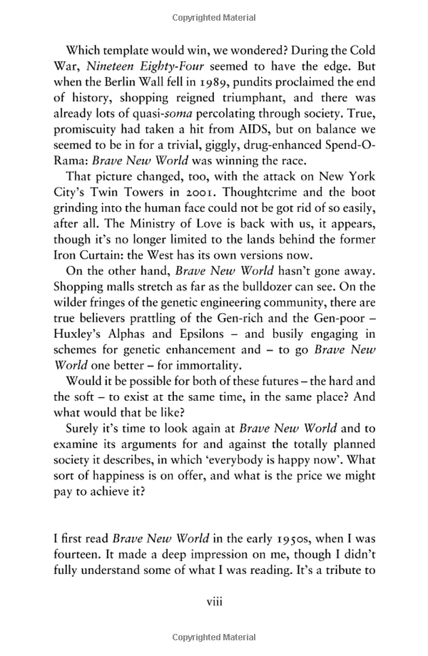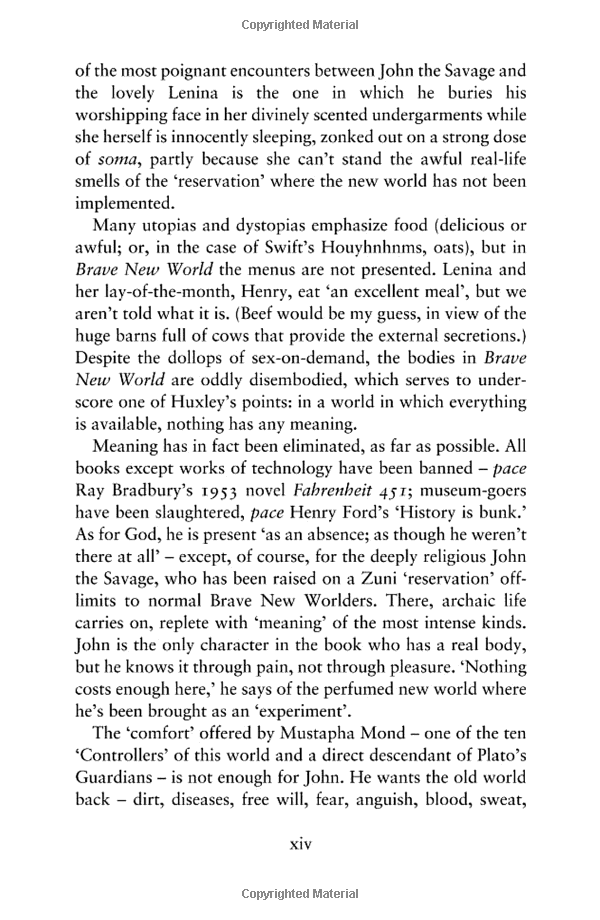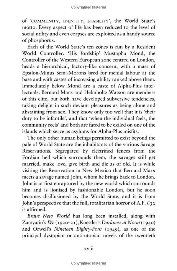 Far in the future, the World Controllers have created the ideal society. Through the clever mix of genetic engineering, brainwashing and recreational sex and drugs, everyone is a happy consumer. Bernard Marx seems alone in his discontent.