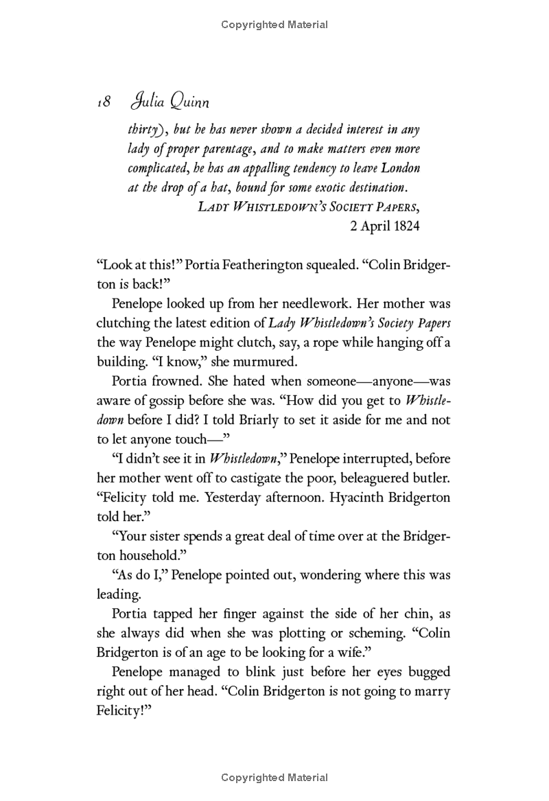 Colin Bridgerton is tired of being thought of as nothing but an empty-headed charmer, tired of the notorious gossip columnist Lady Whistledown, who can’t seem to publish an edition without mentioning him. But when Colin returns to London from a trip abroad, he discovers nothing in his life is quite the same—especially Penelope Featherington! The girl who was always simply there is suddenly the girl haunting his dreams. When he discovers that Penelope has secrets of her own, this elusive bachelor must decide . . . is she his biggest threat— or his promise of a happy ending?