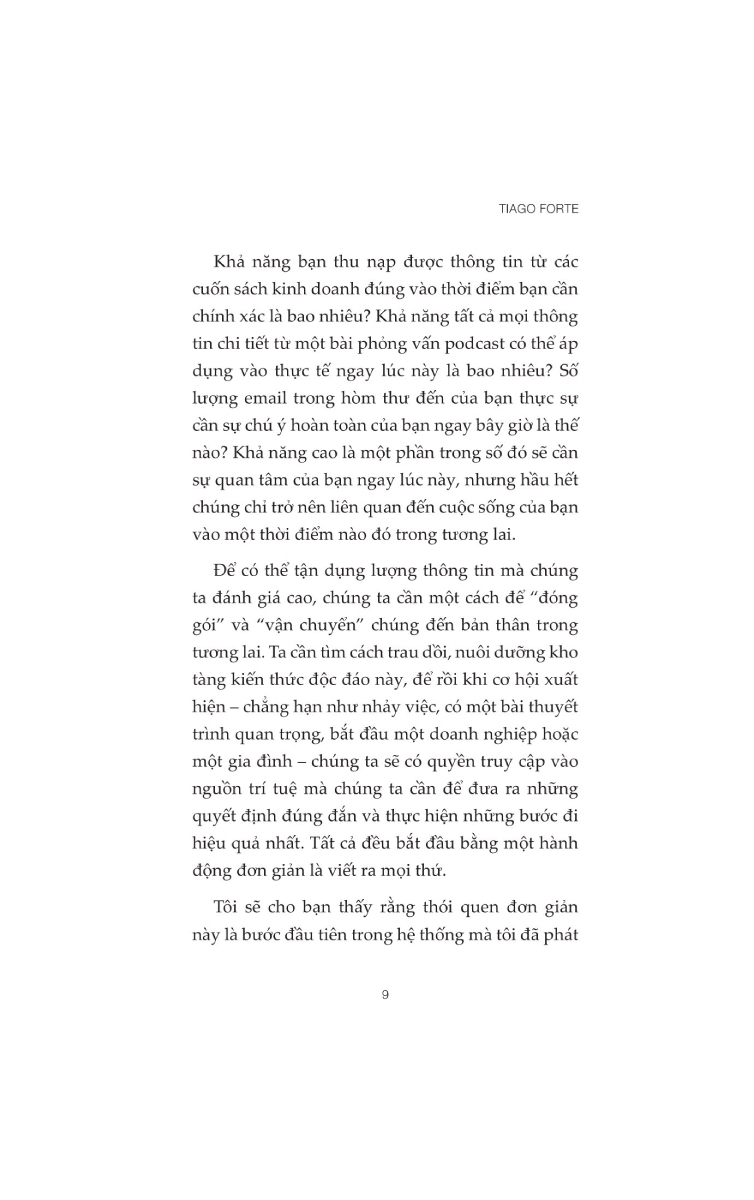 Buiding A Second Brain - Thiết Lập Bộ Não Thứ Hai GIỚI THIỆU SÁCH: Trong thời đại công nghệ thông tin phát triển mạnh mẽ, việc truy cập vào kho tàng kiến thức khổng lồ trở nên dễ dàng hơn bao giờ hết, nhưng cũng đặt ra thách thức về việc quản lý và sử dụng thông tin. Building A Second Brain - Thiết Lập Bộ Não Thứ Hai của Tiago Forte là một cuốn sách mang tính cách mạng, cung cấp hướng dẫn chi tiết về cách xây dựng hệ thống quản lý thông tin cá nhân hiệu quả. Cuốn sách giới thiệu khái niệm "bộ não thứ hai" - một kho lưu trữ kỹ thuật số có tổ chức và đáng tin cậy, giúp bạn lưu trữ, sắp xếp và sử dụng hiệu quả thông tin từ các ý tưởng, ghi chú sáng tạo đến kinh nghiệm quan trọng, đồng bộ hóa trên tất cả các thiết bị và nền tảng. Cuốn sách sẽ giúp bạn xây dựng một hệ thống lưu trữ thông tin cá nhân hiệu quả, tổ chức và lọc thông tin dễ dàng tìm kiếm và sử dụng, áp dụng hệ thống Second Brain vào cuộc sống hàng ngày để đưa ra quyết định và giải quyết vấn đề hiệu quả hơn. Bạn sẽ học cách tự động hóa và tối ưu hóa quy trình lưu trữ và xử lý thông tin, biến những gì bạn biết thành những cải tiến mạnh mẽ và có ý nghĩa trong công việc và cuộc sống. Về tác giả Tiago Forte, ông là một trong những chuyên gia hàng đầu về hiệu suất cá nhân, đã giảng dạy cho hàng nghìn người về các nguyên tắc thời gian và công nghệ tiên tiến nhất để cách mạng hóa năng suất, sự sáng tạo và hiệu quả cá nhân. Ông từng làm việc với nhiều tổ chức lớn như Genentech, Tập đoàn Toyota Motor và Ngân hàng Phát triển Inter-American. Tiago Forte cũng xuất hiện trên nhiều ấn phẩm uy tín như New York Times, The Atlantic và Harvard Business Review.