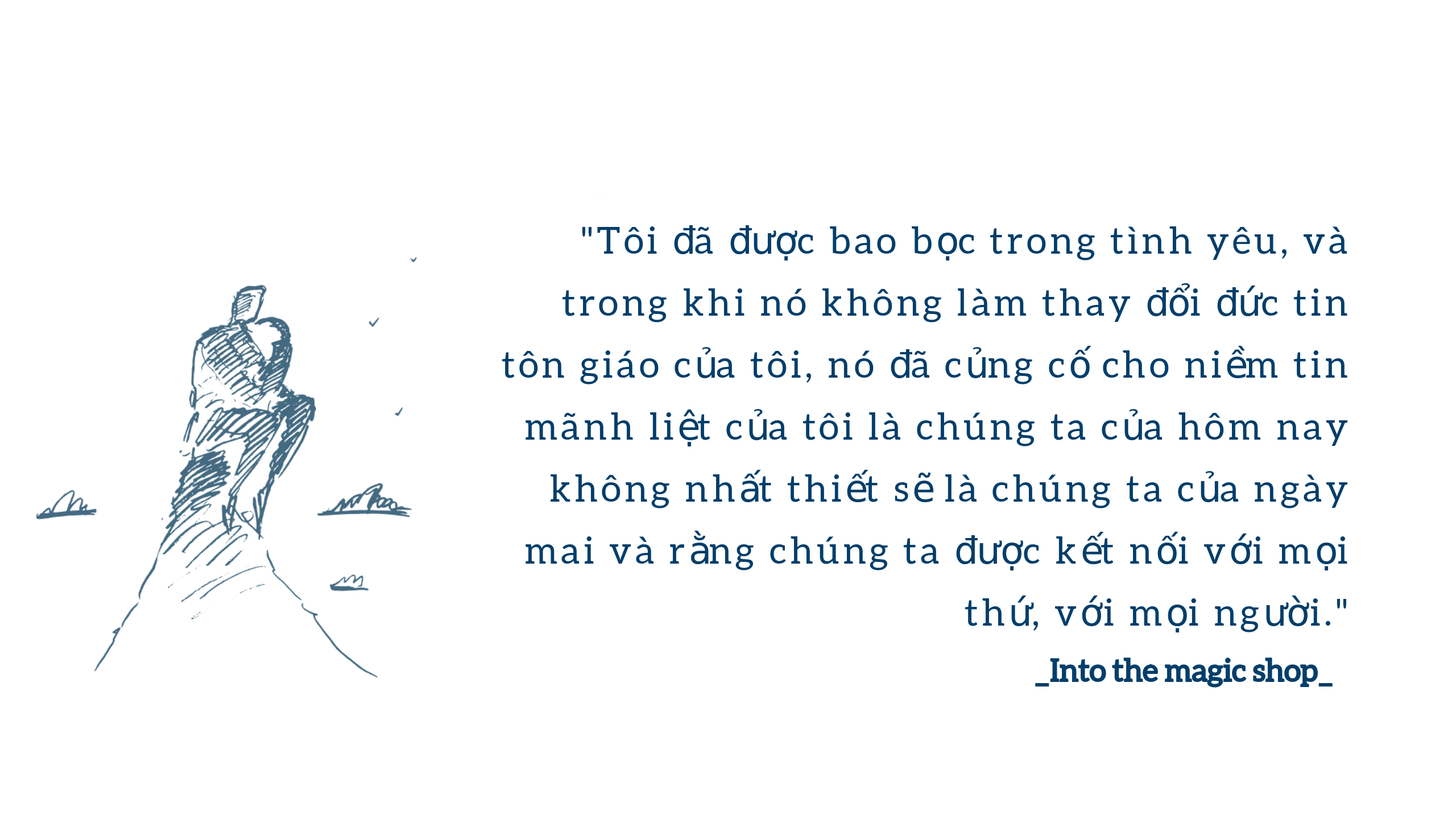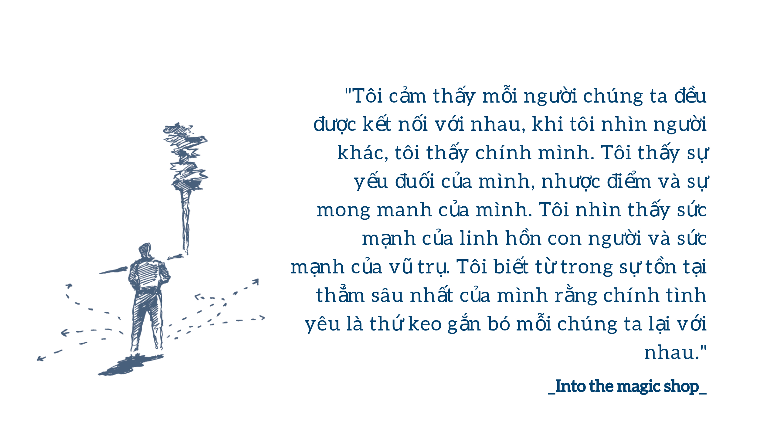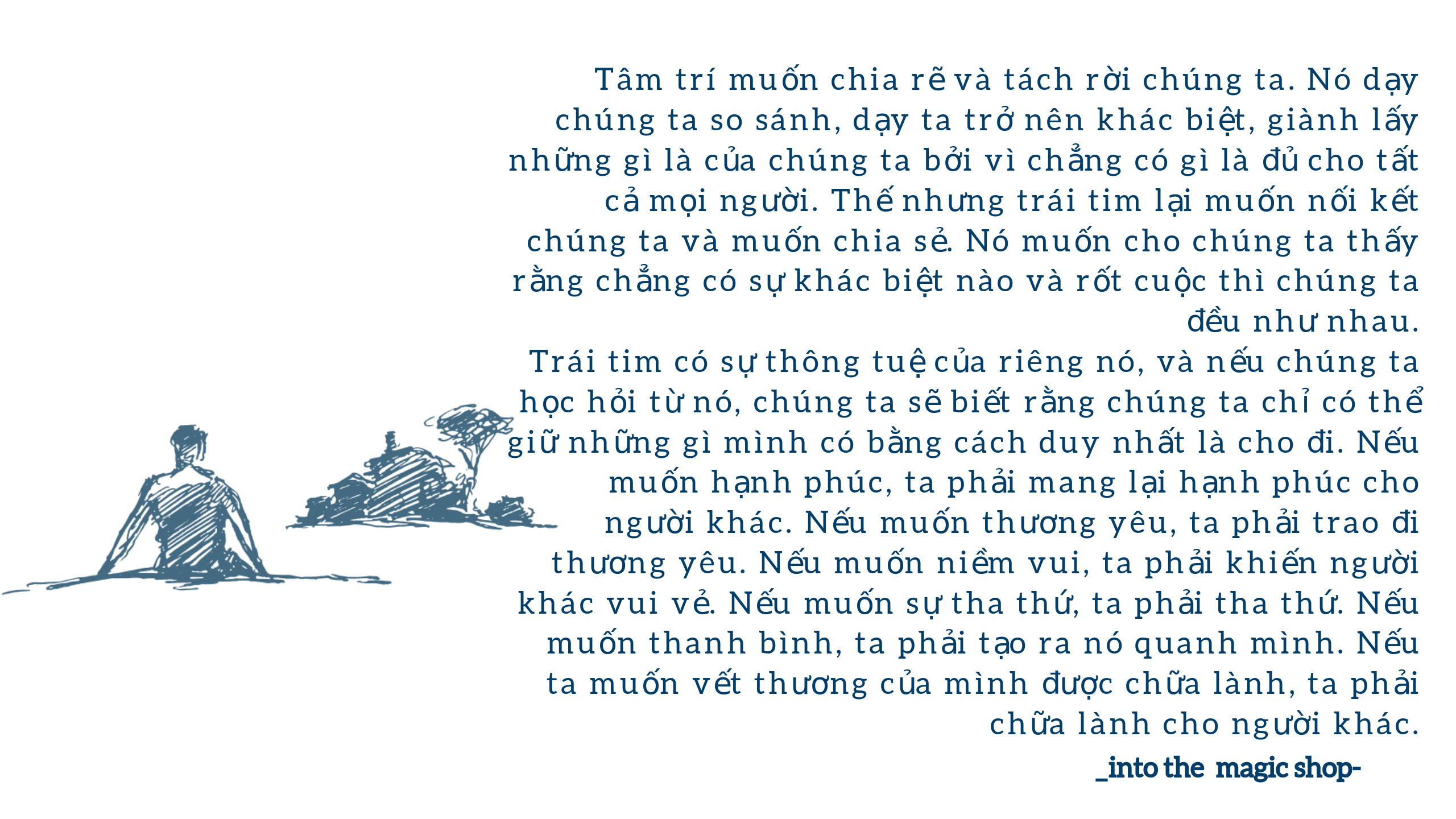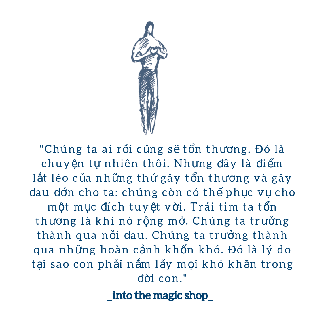 Giống như đứa trẻ Jim Doty nghèo khó ở vùng hoang mạc Lancaster trong cuốn sách, tất cả chúng ta rồi sẽ tổn thương theo cách này hay cách khác và để vượt qua nỗi đau, chúng ta không có cách nào khác là đối diện với chúng. “Cửa hiệu nhiệm màu” vừa là bối cảnh trong câu chuyện, cũng vừa là ẩn dụ về lựa chọn của chúng ta trước những nỗi đau trong đời. Chủ động bước qua cánh cửa của sự thương tổn, để mở rộng trái tim và tự chữa lành cho mình, là cách để chúng ta bước ra khỏi vùng tối của đớn đau và tuyệt vọng.