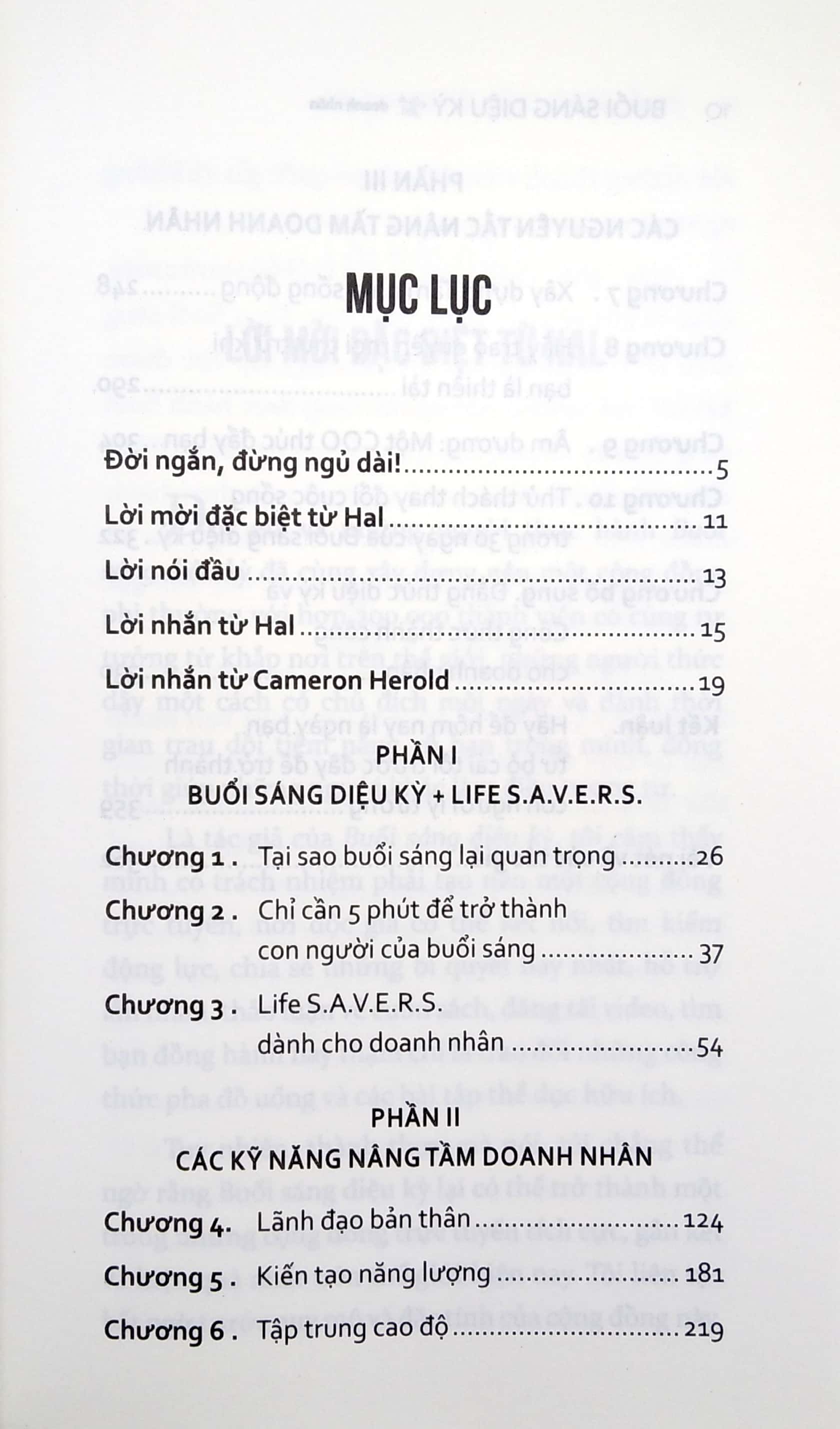 Đầu tiên là khái niệm “Buổi sáng diệu kỳ” (The Miracle Morning) do Hal Elrod khởi xướng – một buổi sáng giúp mọi người hứng khởi, tràn đầy năng lượng, sự tự tin và chuẩn bị tâm thế để đón chào ngày mới và sẵn sàng trước mọi thử thách. Trong Buổi sáng diệu kỳ, tác giả giới thiệu 6 bài thực hành – Life S.A.V.E.R.S – giúp chúng ta có thể cải thiện bản thân, thay đổi cuộc sống và phát triển sự nghiệp rực rỡ. Life S.A.V.E.R.S bao gồm: