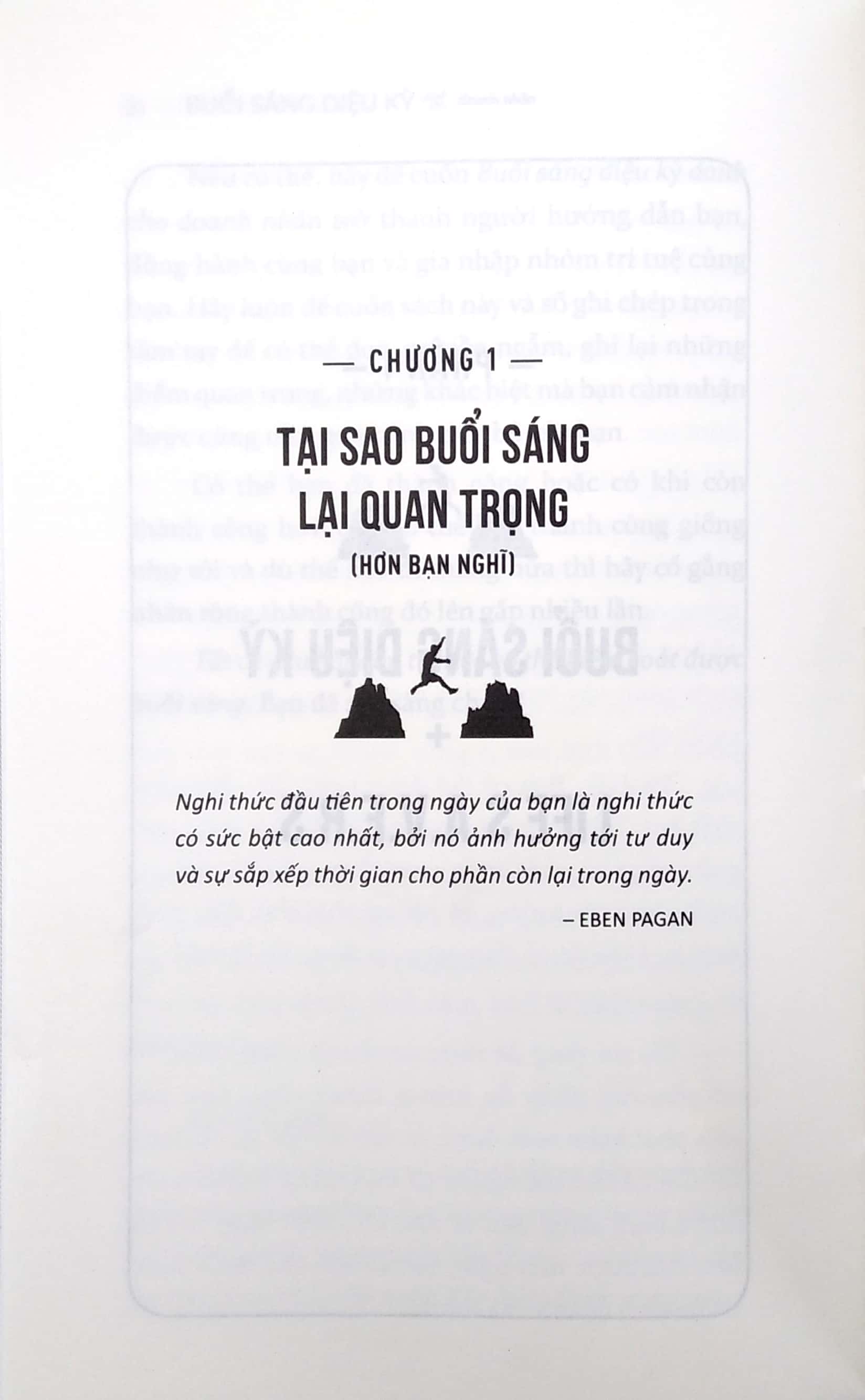 Cuốn sách cung cấp các kỹ năng, bài thực hành vào buổi sáng cho các doanh nhân, giúp họ thay đổi tư duy, phát triển cá nhân và nâng tầm doanh nghiệp, đồng thời giúp họ đạt được thành công ở tất cả các lĩnh vực trong cuộc sống.
