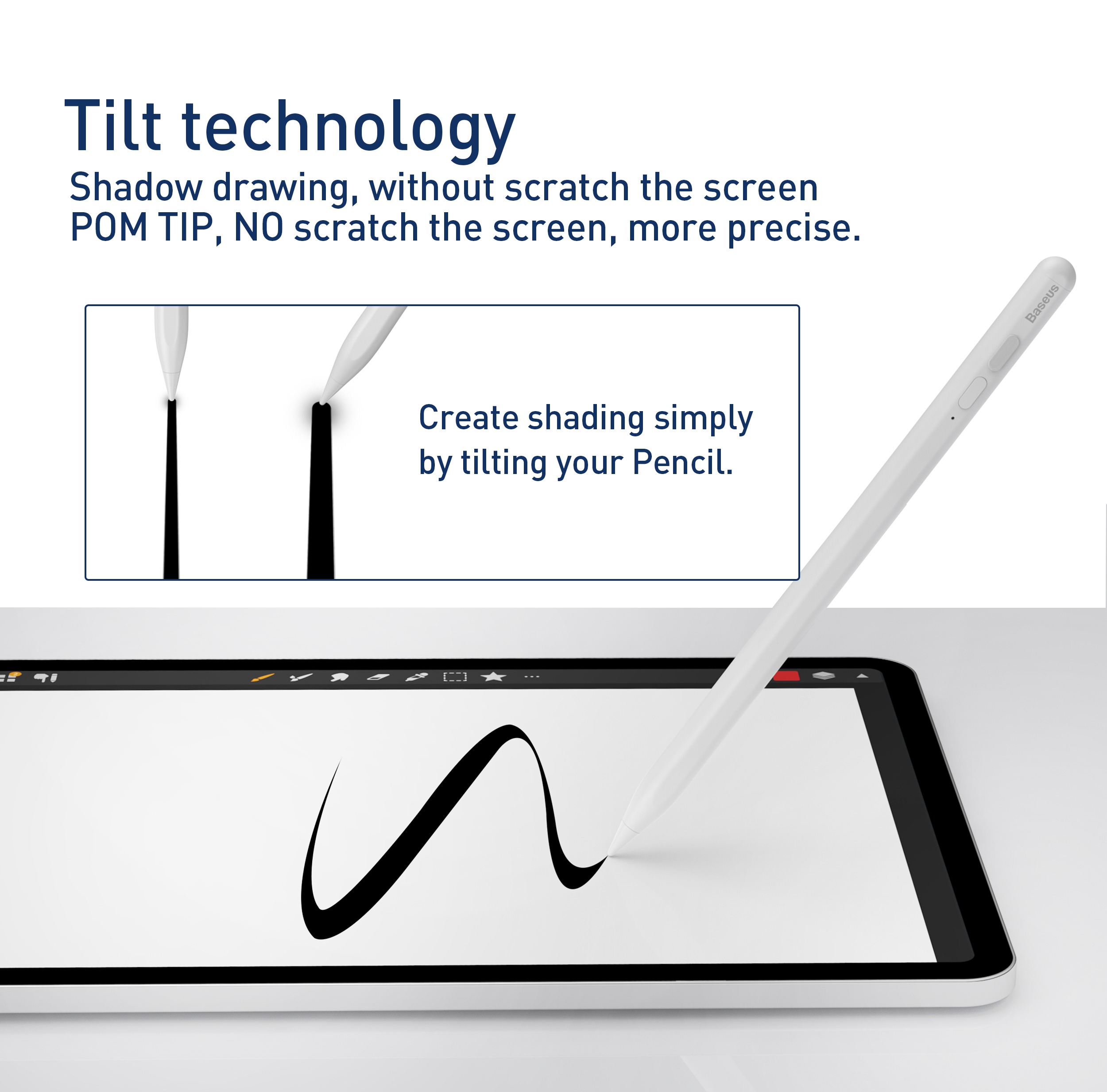 - Bút cảm ứng Baseus Smooth Writing Capacitive Stylus được trang bị Sensor cảm ứng độ nghiên của thân bút và lực nhấn khi sử dụng để tạo ra các nét vẻ đậm nhạt khác nhau . Mang đến trải nghiệm sử dụng như bút thật . Sản phẩm có 2 phiên bản Standard (chỉ dùng được trên các dòng iPad Pro) và Plus (được trang bị thêm 1 đầu cảm ứng thứ 2 , tương thích với hầu tư tất cả các loại màn hình cảm ứng điện dung trên Smartphone/ Tablet Android ) . Thân bút cũng được trang bị nam châm, có thể hít được trên khung viền đối với iPad các dòng có hỗ trợ. Hướng dẫn sử dụng: