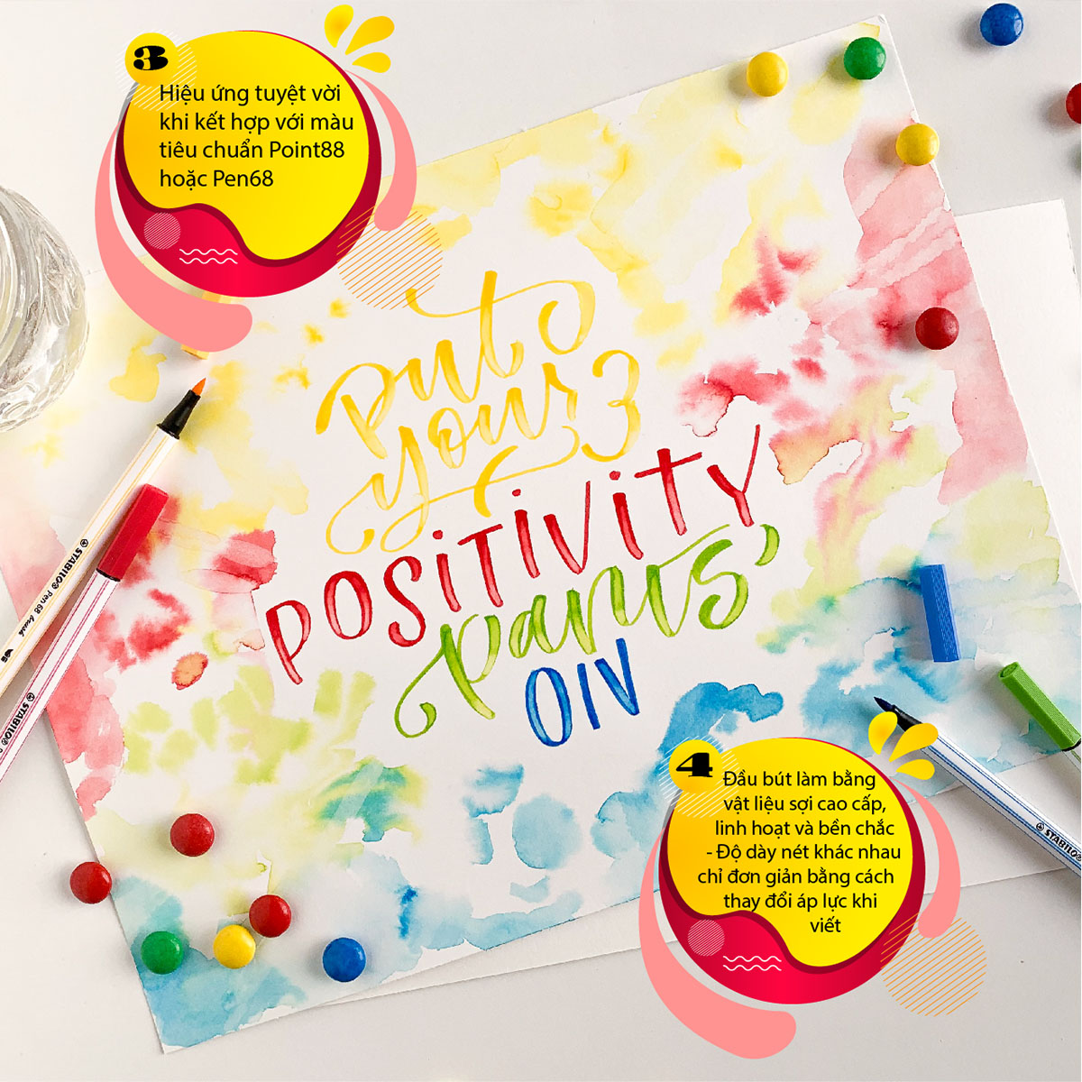 - Màu sắc tươi sáng, cường độ màu cao, bền màu. - Có thể rửa sạch dễ dàng vết màu dính trên da, áo quần,… bằng nước sạch. - Sản phẩm an toàn, không độc