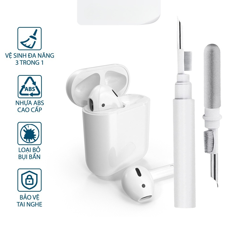 Mô tả sản phẩm Bút vệ sinh tai nghe bluetooth Airpods 3 trong 1 cao cấp - Làm sạch bụi bẩn trong dock sạc, loa, cổng sạc   BỘ DỤNG CỤ ĐA NĂNG GỒM: Đầu bông vệ sinh hộp đựng tai nghe Đầu bút kim loại vệ sinh ngóc ngách Đầu bàn chải mềm vệ sinh cổng loa   Vệ sinh tai nghe, điện thoại, máy tính không đúng cách có thể dẫn đến hư hại và ảnh hưởng tới trải nghiệm sử dụng. Hãy lựa chọn bút vệ sinh cao cấp để dễ dàng, không còn tình trạng bụi bẩn bám lâu ngày trên thiết bị của bạn! ------------   TÍNH NĂNG NỔI BẬT  ------------- VỆ SINH ĐA NĂNG: Với 3 đầu vệ sinh linh hoạt, dụng cụ có thể giúp bạn xử lý nhanh các loại bụi, cặn bẩn bám trên bề mặt thiết bị. Hiệu quả làm sạch vượt trội hơn nhiều lần các loại phương pháp vệ sinh thông thường. CHẤT LIỆU ABS CAO CẤP: Bền bỉ và chắc chắn. THIẾT KẾ NHỎ GỌN, DỄ MANG THEO: Có thể sử dụng được mọi lúc mọi nơi.  BẢO VỆ BỀ MẶT: Sử dụng bút vệ sinh là giải pháp an toàn, dễ dàng ngăn chặn tình trạng bụi bẩn gây hư hại thiết bị.   ------------   THÔNG TIN SẢN PHẨM  ------------- Sản phẩm: Bút vệ sinh tai nghe đa năng Kích thước: 108 x 13 mm (có thể có sai số nhỏ) Chất liệu: Nhựa ABS cao cấp, kim loại Phạm vi áp dụng: Vệ sinh, làm sạch hộp đựng tai nghe bluetooth, tai nghe, điện thoại, máy tính, máy tính bảng, máy ảnh và các sản phẩm kỹ thuật số khác. ------------   HƯỚNG DẪN SỬ DỤNG  -------------
