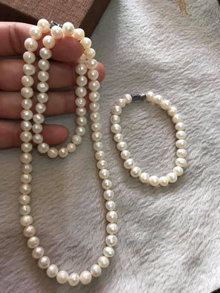 CẢ BỘ VÒNG TAY VÀ DÂY CHUỖI CHẤT LIỆU NGỌC TRAI SIZE HƠN 7MM NỮ ĐEO Ạ