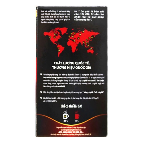 - Được chiết xất từ những hạt cà phê tốt nhất thế giới. Sản xuất trên công nghệ hàng đầu và bí quyết không thể sao chép, cà phê hòa tan G7 2in1 có hương vị mạnh, đúng "gu" uống cà phê đen của người Việt, giữ được vị đắng thật của cà phê rang xay đem đến cho người thưởng thức một ly cà phê đen thứ thiệt.