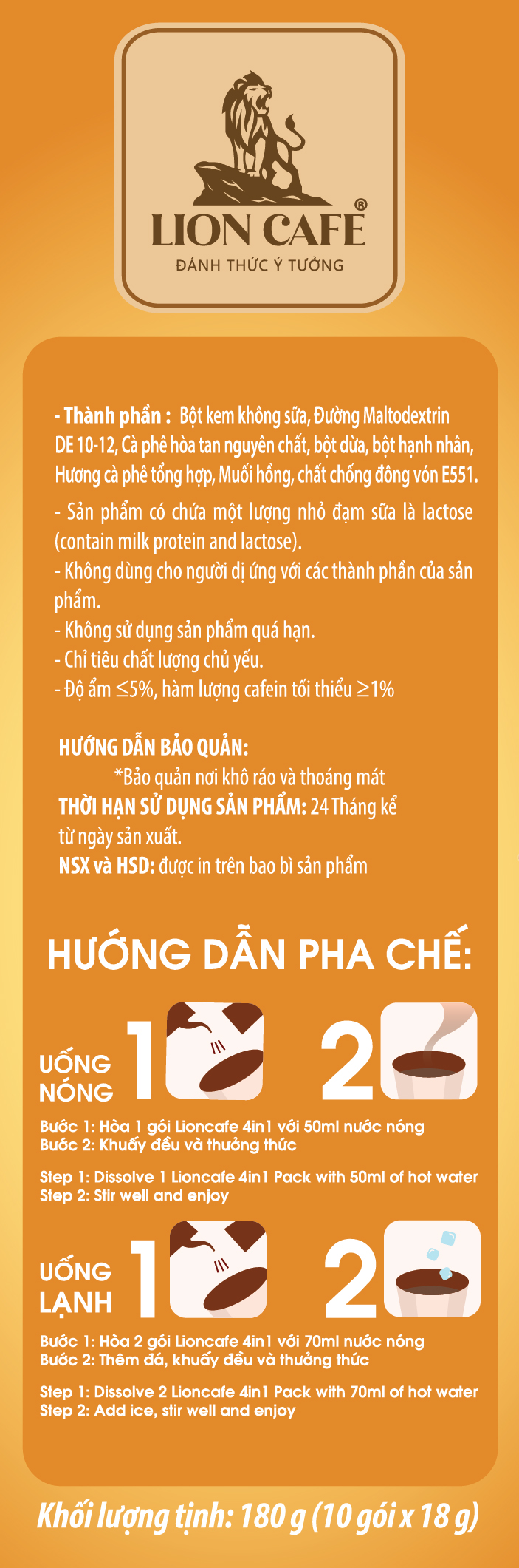 Thành phần: Cà phê hoà tan tinh chất, đường mantozơ (đường mạch nha), đường tinh luyện, hương tổng hợp, muối ăn. Instant coffee (35%), maltoza sugar, white sugar , food flaving, cooking salt. Chỉ tiêu