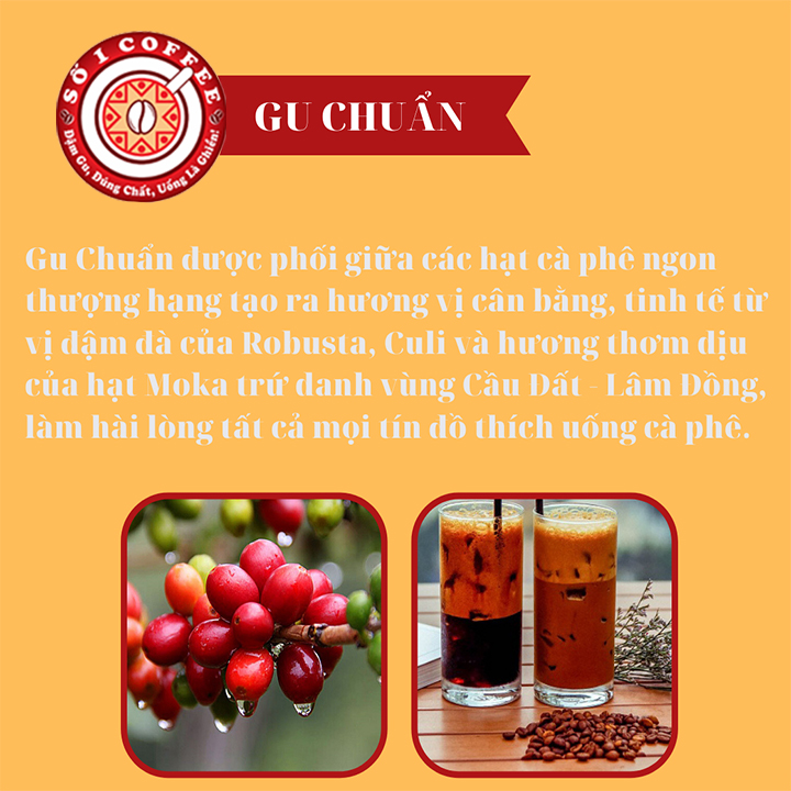 ️ Những hạt cà phê của Số 1 Coffee đều được chọn lọc một cách kĩ càng, có nguồn gốc xuất xứ rõ ràng, hạt sàng 18, có đầy đủ các chứng chỉ chất lượng và xuất khẩu, làm hài lòng tất cả khách hàng kể cả là những yêu cầu khắt khe nhất. ️ Rang bằng công nghệ Hot air hồi khí của Đức, cho ra chất lượng ổn định và đồng đều, cùng với đội ngũ công nhân viên chuyên nghiệp với nhiều năm kinh nghiệm trong nghề ️ Cà phê của Số 1 Coffee không chất bảo quản, không màu thực phẩm, không hương liệu hóa chất độc hại, không trộn đậu rang và bắp rang, không đường caramel và không tạp chất ️ Cà phê Số 1 Coffee Gu Chuẩn là loại cà phê mang vị hài hòa, hương tinh tế, hòa quyện giữa cá tính mạnh mẽ và dịu dàng, làm hài lòng tất cả mọi người ️ Cà phê của Số 1 Coffee được chọn lọc kỹ càng tại vùng nguyên liệu Đắk Lắk, Lâm Đồ thu hoạch từ quả chín. Kết hợp với kỹ thuật rang chuyên nghiệp của đội ngũ rang Số 1 Coffee trên máy rang cà phê công nghệ hot air hồi khí, hạt cà phê chín đều, hương thơm nồng nàn, lôi cuốn. ️ Cà phê Số 1 Coffee phù hợp với những tín đồ cà phê thích hương vị cà phê đậm đà, pha sẵn để dùng với vị đắng nguyên chất và tinh tế, vị cà phê đặc trưng, tràn đầy năng lượng và sáng tạo. ️ Chúng tôi gửi đến những người yêu và sành cà phê hơn cả một ly cà phê thơm ngon, quyến rũ bậc nhất mà còn là một năng lượng đặc biệt cho cuộc sống.Không pha thêm bất kỳ hóa chất hay phụ gia thực phẩm nào khác, đảm bảo cho sức khỏe của người tiêu dùng, một sản phẩm vừa ngon vừa tốt cho sức khỏe. Nếu bạn là người tinh tế và có vị giác, bạn sẽ cảm nhận được ngay hương vị, sự thanh khiết, vị đắng, vị ngọt thanh sau cùng. ️ Giá sản phẩm đã bao gồm thuế theo luật hiện hành. Tuy nhiên tuỳ vào từng loại sản phẩm hoặc phương thức, mà có thể phát sinh thêm chi phí khác như phí vận chuyển, phụ phí hàng cồng kềnh.