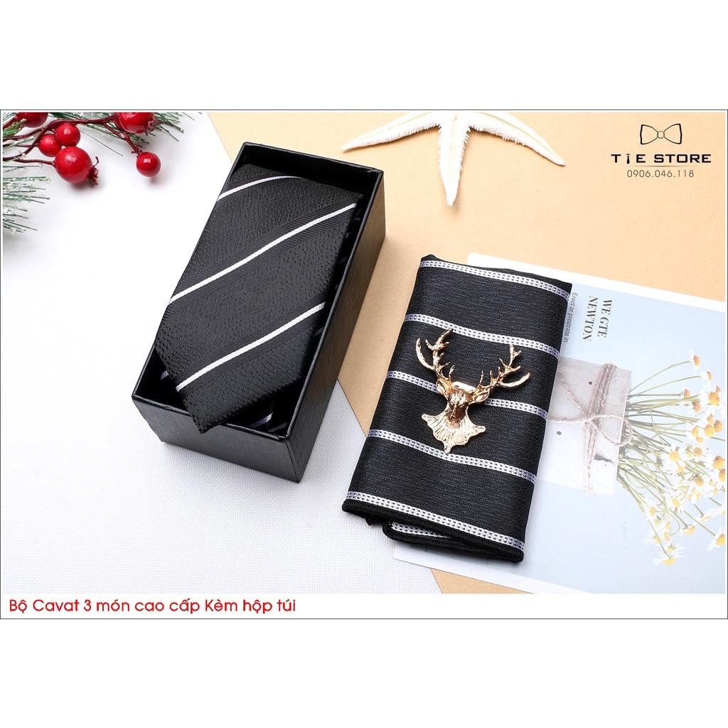 ✨Ca Vat bộ 3 món kèm hộp túi xách cao cấp, quà tặng chú rể, Cavat họa tiết đen kẻ trắng