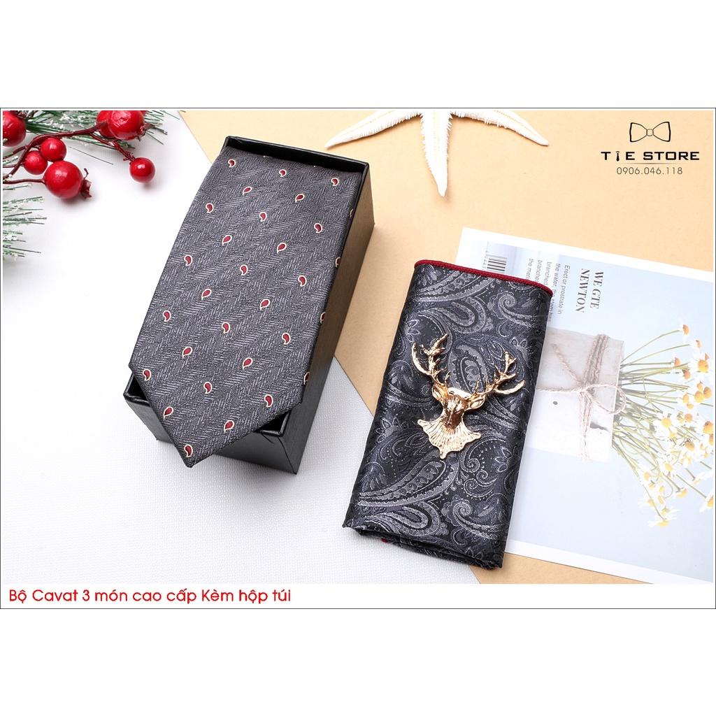 ✨Ca Vat bộ 3 món kèm hộp túi xách cao cấp, quà tặng chú rể, Cavat họa tiết ghi xám