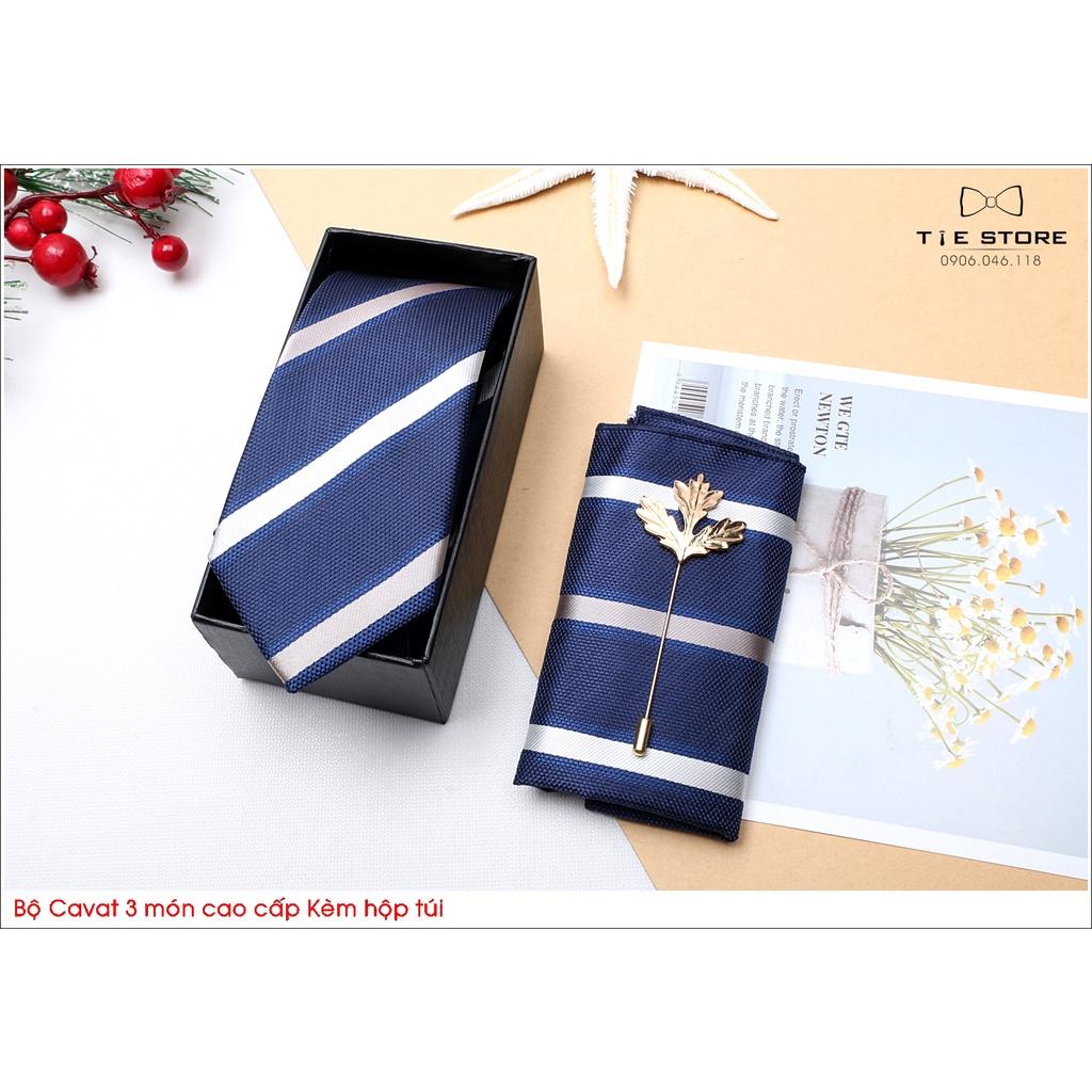 ✨Ca Vat bộ 3 món kèm hộp túi xách cao cấp, quà tặng chú rể, Cavat họa tiết xanh kẻ trắng