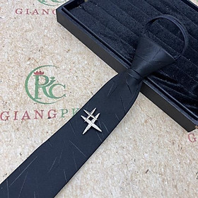Cà vạt nam màu đen bản nhỏ thắt sẵn 6cm đính sao 4 cánh mẫu đen kẻ xước