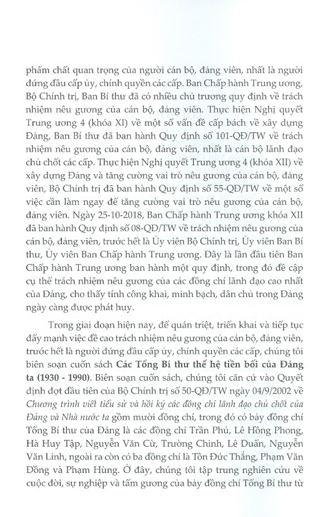 Trong giai đoạn hiện nay, để quán triệt, triển khai và tiếp tục đẩy mạnh việc đề cao trách nhiệm nêu gương của cán bộ, đảng viên, trước hết là người đứng đầu cấp ủy, chính quyền các cấp, chúng tôi biên soạn cuốn sách Các Tổng Bí thư thế hệ tiền bối của Đảng ta (1930 - 1990). Biên soạn cuốn sách, chúng tôi căn cứ vào Quyết định đợt đầu tiên của Bộ Chính trị số 50-QĐ/TW ngày 04/9/2002 về Chương trình viết tiểu sử và hồi ký các đồng chí lãnh đạo chủ chốt của Đảng và Nhà nước ta gồm mười đồng chí, trong đó có bảy đồng chí Tổng Bí thư của Đảng là các đồng chí Trần Phú, Lê Hồng Phong, Hà Huy Tập, Nguyễn Văn Cừ, Trường Chinh, Lê Duẩn, Nguyễn Văn Linh, ngoài ra còn có ba đồng chí là Tôn Đức Thắng, Phạm Văn Đồng và Phạm Hùng. Ở đây, chúng tôi tập trung nghiên cứu về cuộc đời, sự nghiệp và tấm gương của bảy đồng chí Tổng Bí thư từ năm 1930 đến năm 1990. Còn các Tổng Bí thư từ năm 1991 đến nay chúng tôi đang sưu tầm tài liệu để bổ sung cho lần xuất bản sau. Trong quá trình biên soạn, chúng tôi đã có sự kế thừa tham khảo các công trình viết về các đồng chí Tổng Bí thư của các tác giả khác.