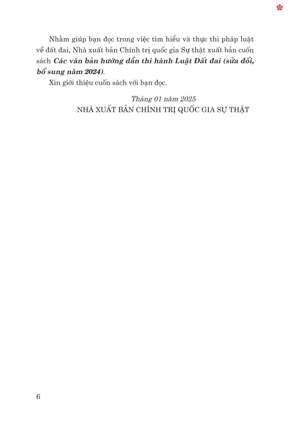 Nhằm giúp bạn đọc trong việc tìm hiểu và thực thi pháp luật về đất đai, Nhà xuất bản Chính trị quốc gia Sự thật xuất bản cuốn sách Các văn bản hướng dẫn thi hành Luật Đất đai (sửa đổi, bổ sung năm 2024).