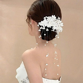 Trâm cài tóc cô dâu thiết kế ngọc trai và hoa 5 canh mềm mại, nữ tính. Tôn lên vẻ đẹp cho mái tóc xinh. Thích hợp trang điểm, make up cô dâu, trang điểm