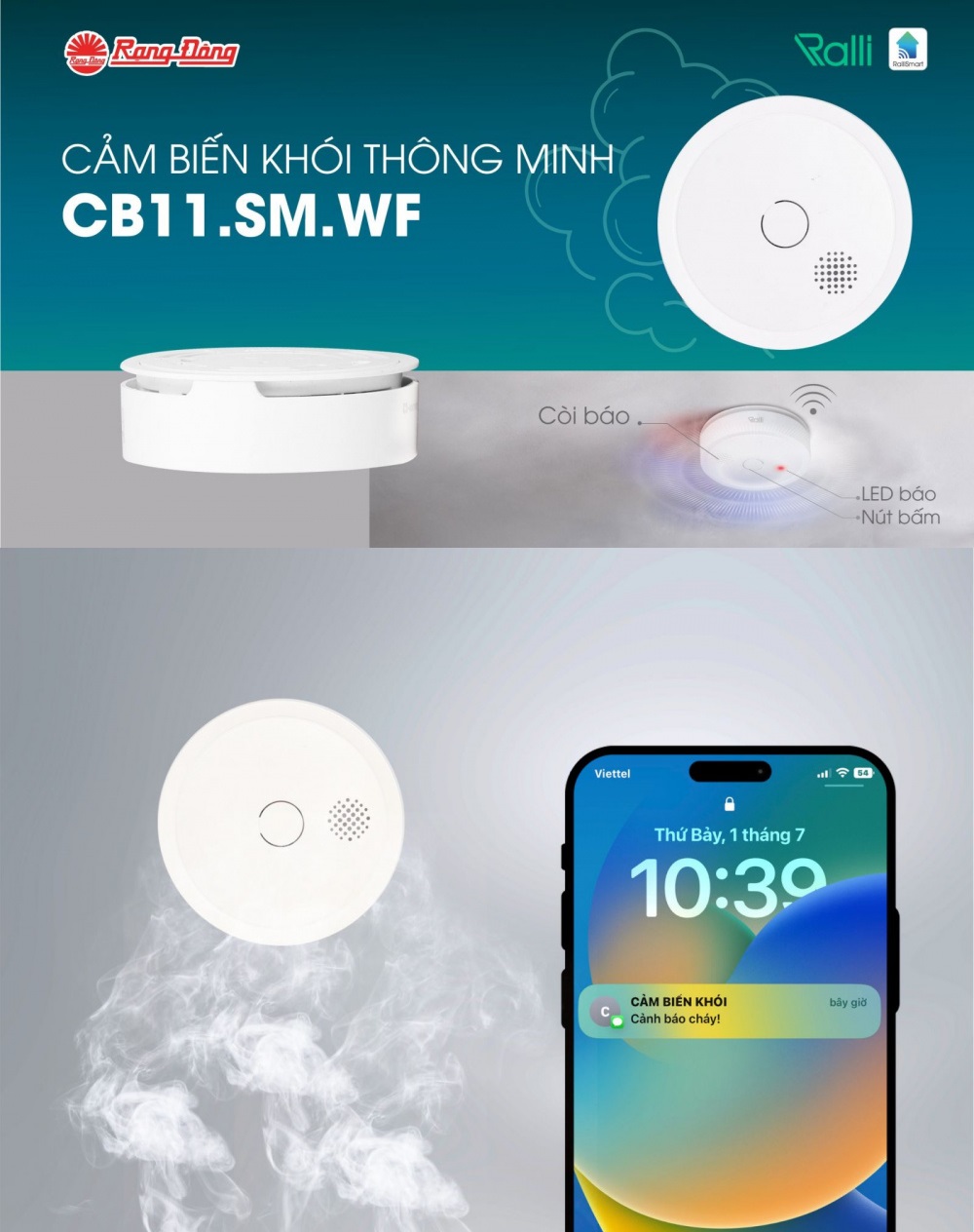 Cảm biến khói báo cháy thông minh Rạng Đông CB11.SM.WF kết nối wifi không dây điều khiển từ xa qua app Thương hiệu Rạng Đông uy tín tin cậy được khẳng định bởi người tiêu