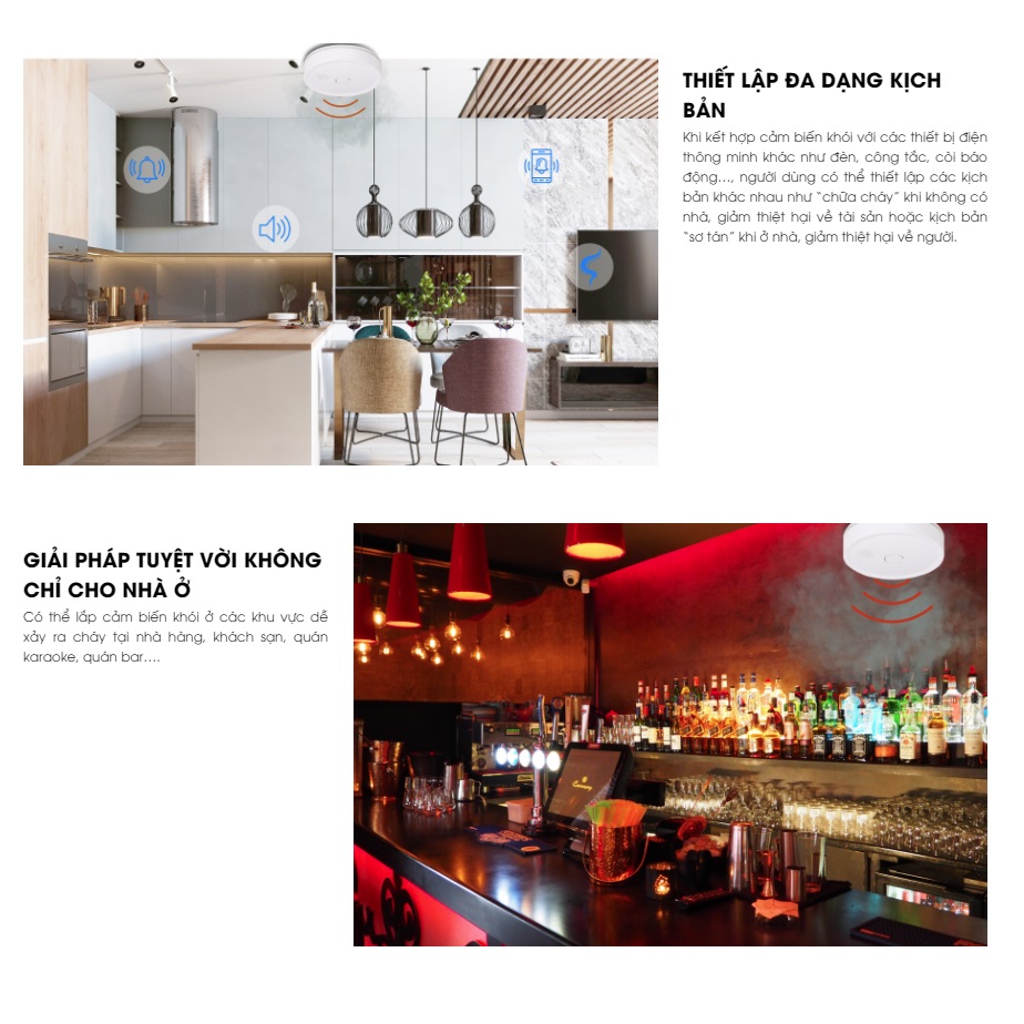 Khi kết hợp cảm biến khói với các thiết bị điện thông minh khác như đèn, công tắc, còi báo động…, người dùng có thể thiết lập các kịch bản khác nhau như “chữa cháy” khi không có nhà, giảm thiệt hại về tài sản hoặc kịch bản “sơ tán” khi ở nhà, giảm thiệt hại về người.