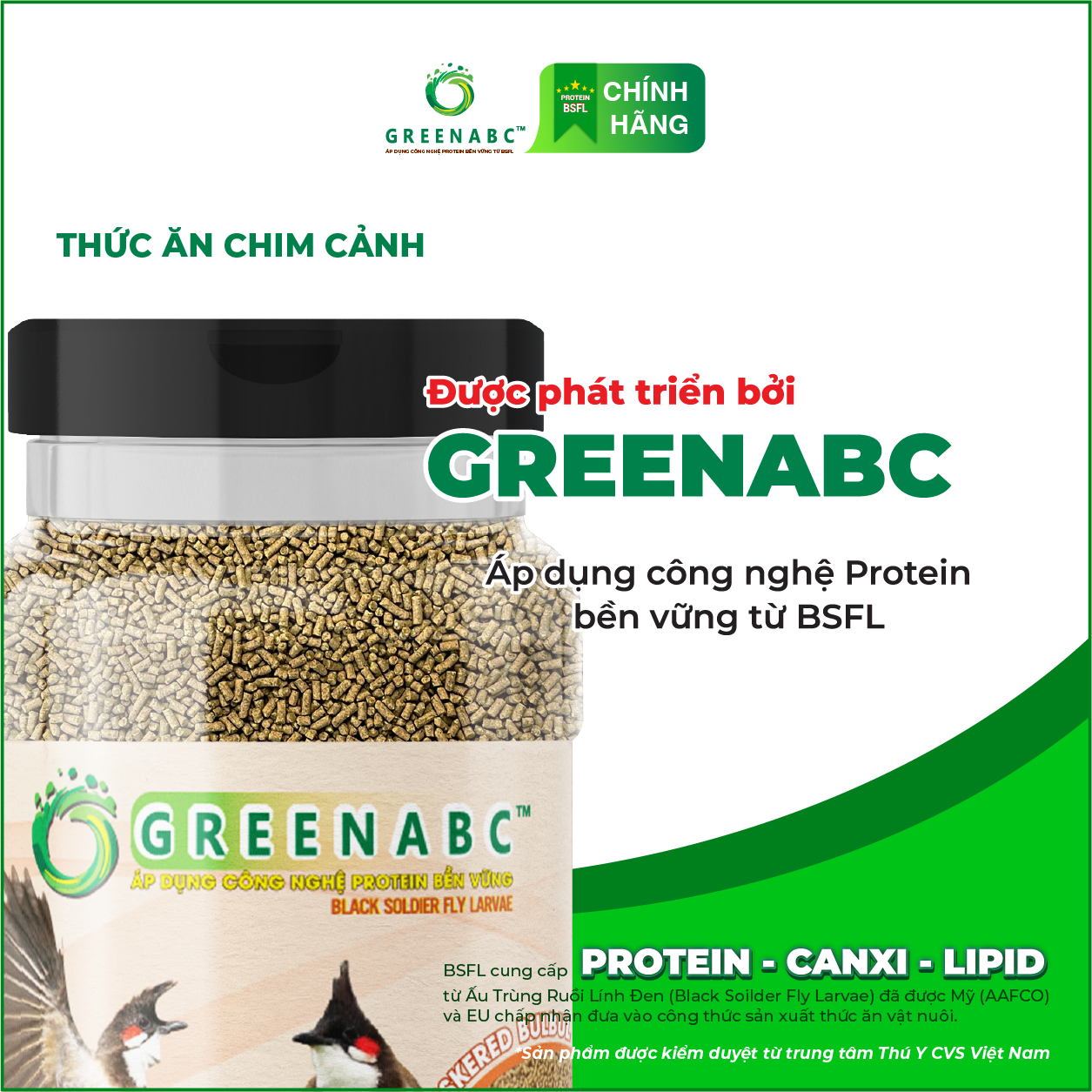 GREENABC - THỨC ĂN CHIM CHÀO MÀO GREENABC là thức ăn cao cấp dành cho CHIM CHÀO MÀO. Đặc biệt sản phẩm GREENABC được sản xuất theo phương pháp Áp dụng công nghệ PROTEIN bền