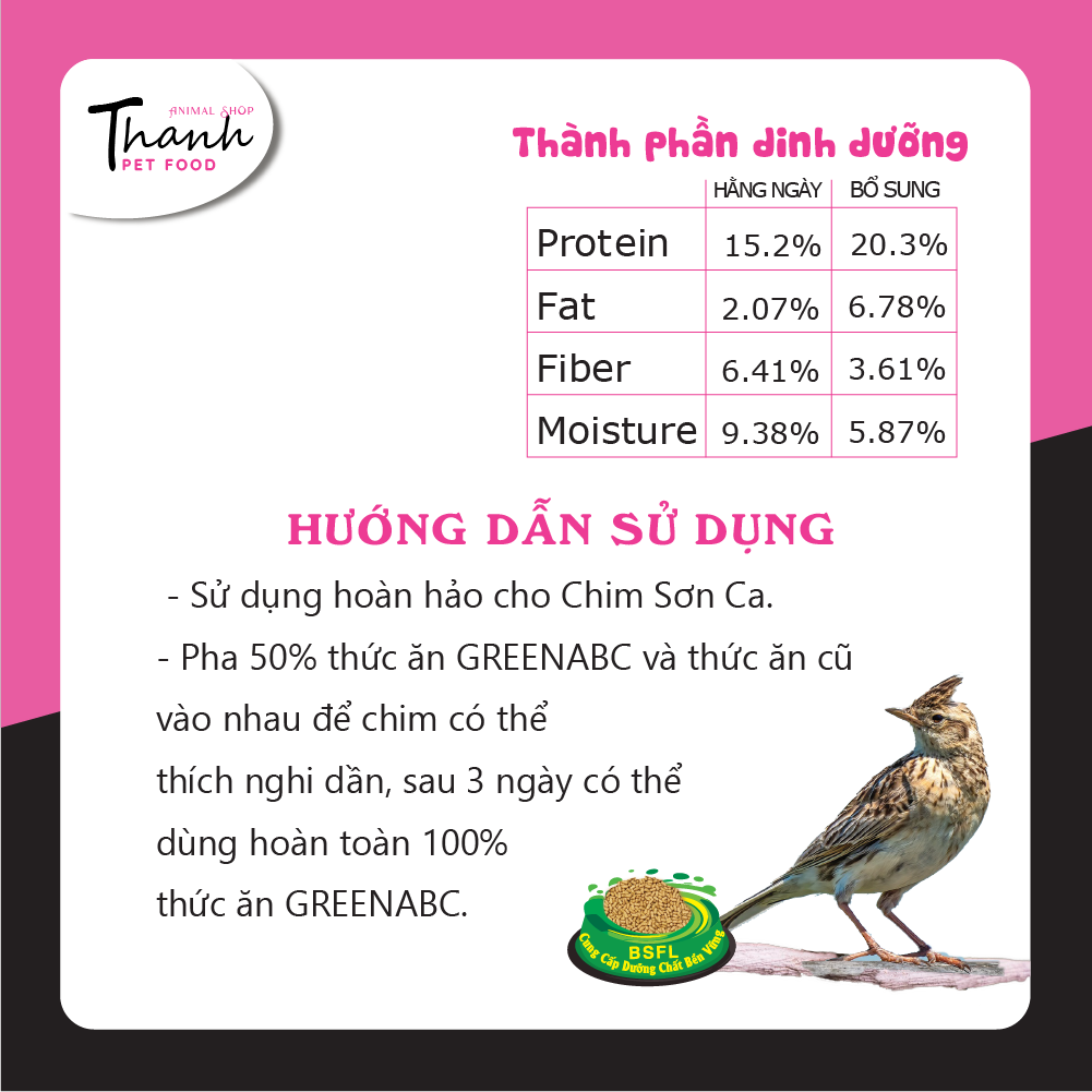 GREENABC - THỨC ĂN CHIM CHÍCH CHÒE HÀNG NGÀY & BỔ SUNG GREENABC là thức ăn cao cấp dành cho CHIM CHÍCH CHÒE. Đặc biệt sản phẩm GREENABC được sản xuất theo phương pháp Áp
