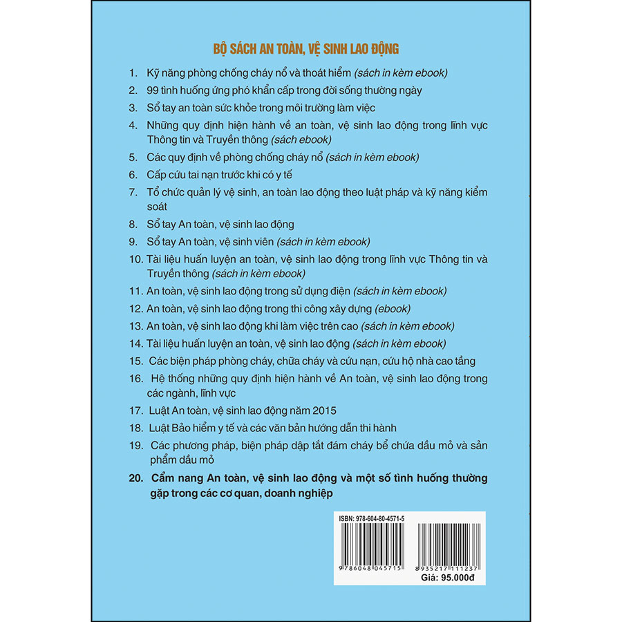 Cuốn sách sẽ hỗ trợ đắc lực cho người sử dụng lao động, người lao động cũng như các cán bộ quản lý trong doanh nghiệp, cơ sở sản xuất để nâng cao hiệu quả của công tác ATVSLĐ;