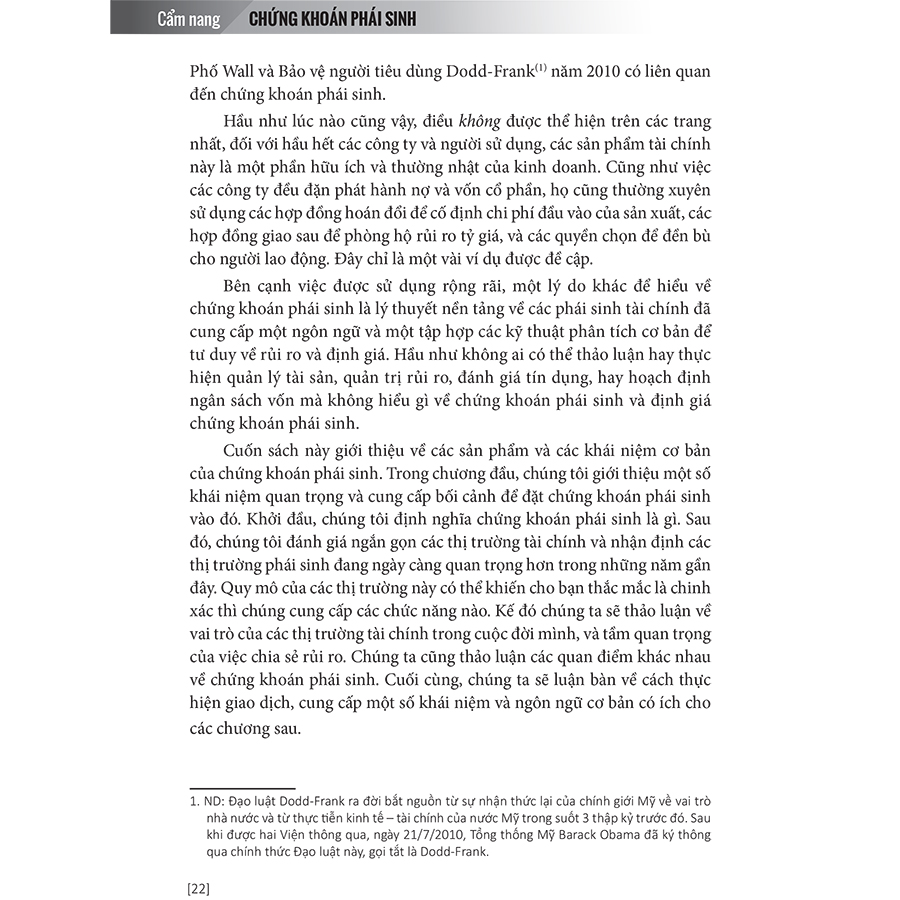 Cuốn sách này giới thiệu về các sản phẩm và các khái niệm cơ bản của chứng khoán phái sinh. Trong chương đầu, chúng tôi giới thiệu một số khái niệm quan trọng và cung cấp bối cảnh để đặt chứng khoán phái sinh vào đó. Khởi đầu, chúng tôi định nghĩa chứng khoán phái sinh là gì. Sau đó, chúng tôi đánh giá ngắn gọn các thị trường tài chính và nhận định các thị trường phái sinh đang ngày càng quan trọng hơn trong những năm gần đây. Quy mô của các thị trường này có thể khiến cho bạn thắc mắc là chính xác thì chúng cung cấp các chức năng nào. Kế đó chúng ta sẽ thảo luận về vai trò của các thị trường tài chính trong cuộc đời mình, và tầm quan trọng của việc chia sẻ rủi ro. Chúng ta cũng thảo luận các quan điểm khác nhau về chứng khoán phái sinh. Cuối cùng, chúng ta sẽ luận bàn về cách thực hiện giao dịch, cung cấp một số khái niệm và ngôn ngữ cơ bản có ích cho các chương sau.