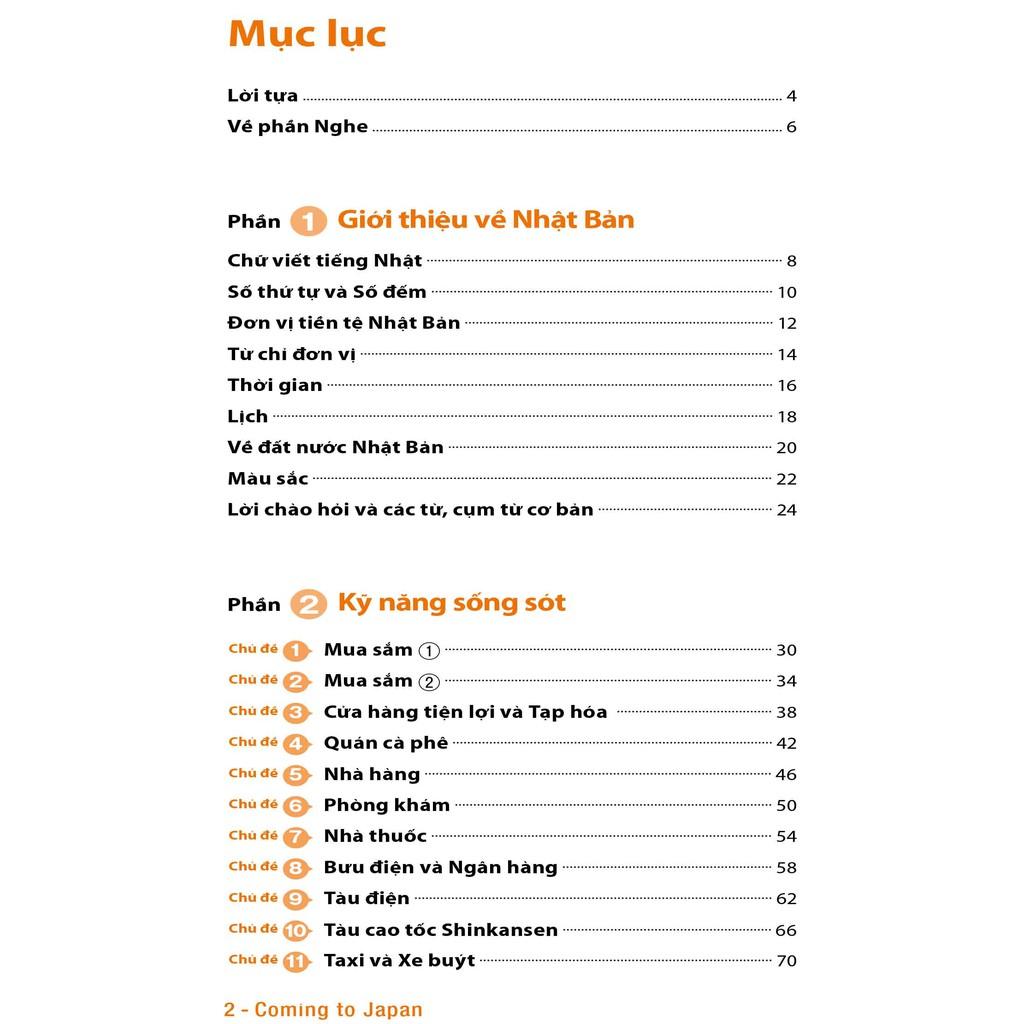 Phần 2 & 3: giới thiệu các từ và cụm từ tiếng Nhật hữu dụng khi đi mua sắm ở cửa hàng tiện lợi, giao tiếp ở nhà hàng và bệnh viện. Phần 3 hướng dẫn những từ và cụm từ tiếng Nhật được dùng trong những tình huống như giới thiệu về bản thân, sử dụng các phương tiện truyền thông hay hẹn gặp ai đó.