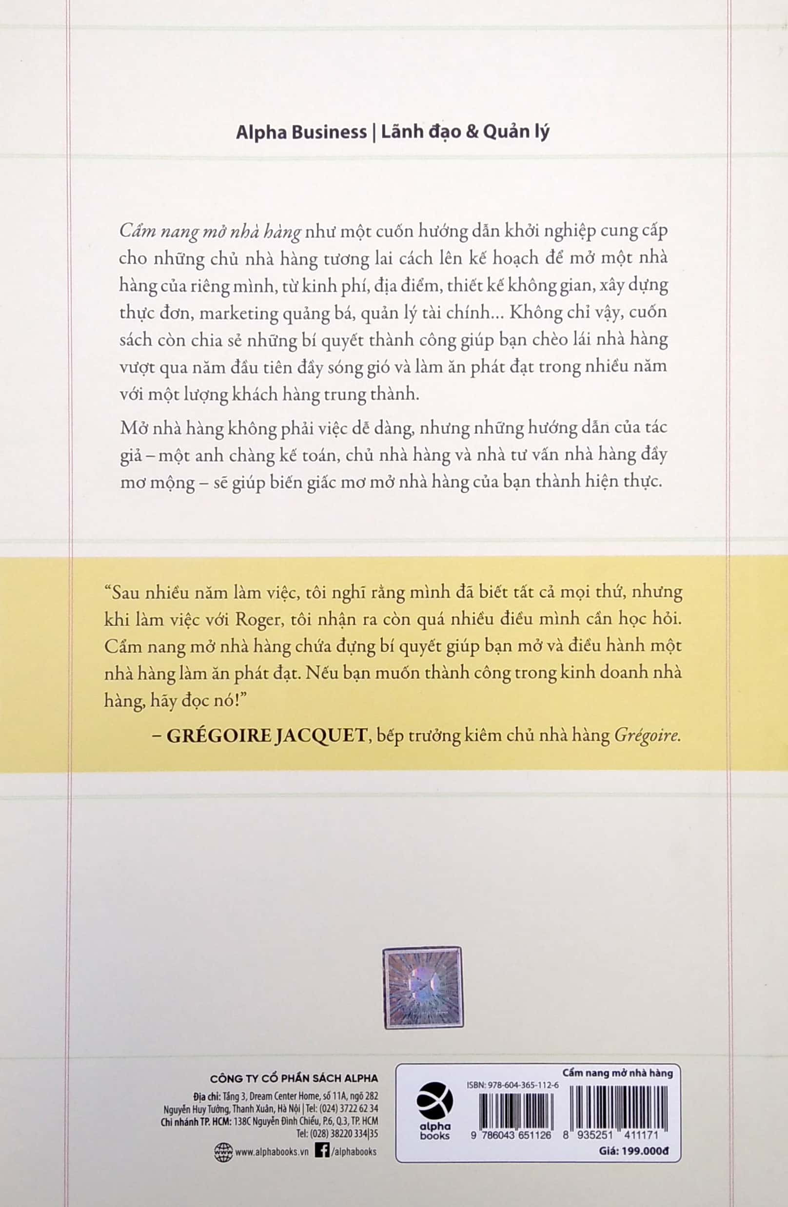 “Sau nhiều năm làm việc, tôi nghĩ rằng mình đã biết tất cả mọi thứ, nhưng khi làm việc với Roger, tôi nhận ra còn quá nhiều điều mình cần học hỏi. Cẩm nang mở nhà hàng chứa đựng bí quyết giúp bạn mở và điều hành một nhà hàng làm ăn phát đạt. Nếu bạn muốn thành công trong kinh doanh nhà hàng, hãy đọc nó!” - GRÉGOIRE JACQUET, bếp trưởng kiêm chủ nhà hàng Grégoire