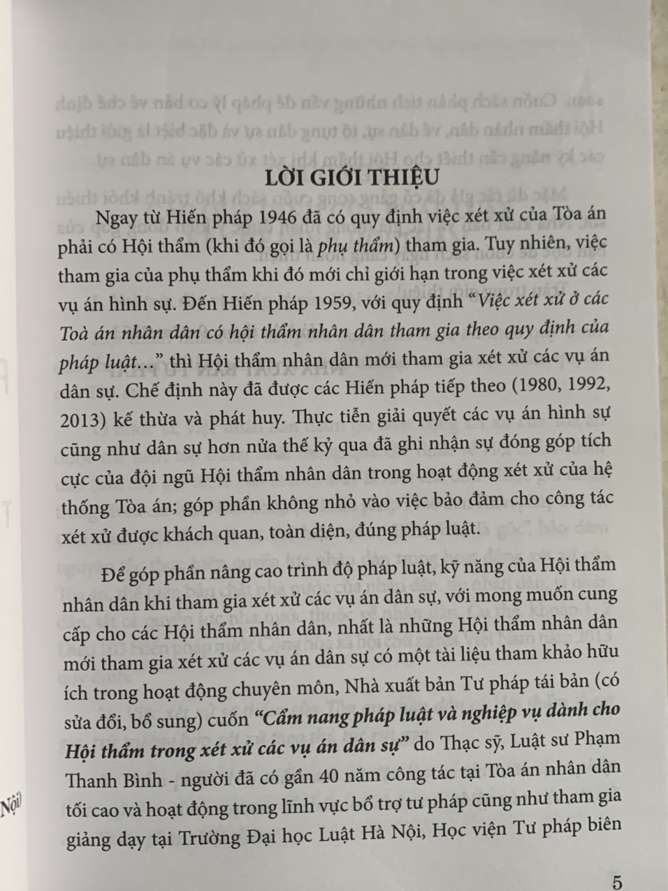 Để góp phần nâng cao trình độ pháp luật, kỹ năng của Hội thẩm nhân dân khi tham gia xét xử các vụ án dân sự, với mong muốn cung cấp cho các Hội thẩm nhân dân, nhất là những Hội thẩm nhân dân mới tham gia xét xử các vụ án dân sự có một tài liệu tham khảo hữu ích trong hoạt động chuyên môn, Nhà xuất bản Tư pháp tái bản (có sửa đổi, bổ sung) cuốn “Cẩm nang pháp luật và nghiệp vụ dành cho Hội thẩm trong xét xử các vụ án dân sự” do Thạc sỹ, Luật sư Phạm Thanh Bình - người đã có gần 40 năm công tác tại Tòa án nhân dân tối cao và hoạt động trong lĩnh vực bổ trợ tư pháp cũng như tham gia giảng dạy tại Trường Đại học Luật Hà Nội, Học viện Tư pháp biện soạn. Cuốn sách phân tích những vấn đề pháp lý cơ bản về chế định Hội thẩm nhân dân, về dân sự, tố tụng dân sự và đặc biệt là giới thiệu các kỹ năng cần thiết cho Hội thẩm khi xét xử các vụ án dân sự.