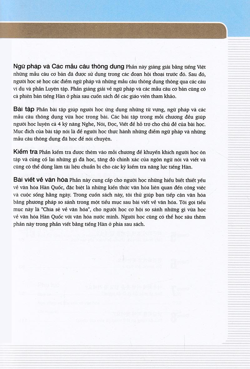 Tiếng Hàn Tổng Hợp Dành Cho Người Việt Nam - Sơ Cấp 1 Trong những năm gần đây, nhu cầu học tiếng Hàn và tìm hiểu về văn hóa Hàn Quốc đang có xu hướng tăng lên. Người học tiếng Hàn rất mong muốn có được một bộ giáo trình chuẩn, được biên soạn một cách tỉ mỉ và hữu ích nhất. Giáo trình tiếng Hàn tổng hợp lần đầu tiên được trao bản quyền chính thức tại Việt Nam Hiểu được điều đó, ngày 4-7, Đại diện chính phủ Hàn Quốc, ngài Woo Hyeong Min – Trưởng đại diện Văn phòng Quỹ giao lưu Quốc tế HQ tại Việt Nam cùng GS.TS.NGƯT Mai Ngọc Chừ – Chủ tịch Hội Nghiên cứu khoa học về Hàn Quốc của Việt Nam (KRAV) đã trao quyết định cho phép Công ty Cổ phần sách MCBooks của Việt Nam được xuất bản cuốn sách này tại thị trường Việt Nam. Và đây chính là bộ giáo trình tiếng Hàn tổng hợp đầu tiên có bản quyền chính thức có mặt tại Việt Nam. Cũng theo ông Woo Hyeong Min, Thực tế đây là bộ giáo trình chính thống mà tất cả người học tiếng Hàn tại Việt Nam cần sử dụng. Tuy nhiên nhiều năm qua bộ sách đến tay người dùng đều là sách lậu nên chưa đạt được kết quả mà chính phủ Hàn muốn mang tới Việt Nam. Do đó Chính phủ Hàn Quốc đã quyết định tìm 1 đơn vị xuất bản uy tín của Việt Nam để giúp họ mang đến cho người học những cuốn sách tiếng Hàn chất lượng tốt với giá cả hợp lý. Bộ giáo trình được Hội nghiên cứu khoa học Hàn Quốc của Việt Nam biên soạn và hiệu đính. Bộ giáo trình sẽ giúp nâng cao hiệu quả trong việc sử dụng ngôn ngữ Hàn sau tiếng mẹ đẻ và tiếng Anh, là nền tảng giúp người lao động Việt Nam nhận được những vị trí làm việc cao trong doanh nghiệp Hàn Quốc. Đây cũng là cách để thúc đẩy quan hệ hợp tác về văn hoá và giáo dục giữa hai nước trong thời gian tới. Giới thiệu cuốn Giáo trình tiếng Hàn tổng hợp dành cho người Việt Nam – Sơ cấp 1 Giáo trình tiếng Hàn tổng hợp dành cho người Việt Nam – Sơ cấp 1 được biên soạn dành cho người Việt Nam muốn học tiếng Hàn ở trình độ sơ cấp. Sách được biên soạn nhằm hướng tới việc sử dụng được trong các tiết học tiếng Hàn tại giảng đường đại học nên mỗi bài học được chia thành nhiều phần như: Lý thuyết cơ bản gồm từ vựng và cấu trúc ngữ pháp; phần luyện tập theo 4 kỹ năng giao tiếp như: Nghe – Nói – Đọc – Viết, phần luyện phát âm, phần tìm hiểu văn hóa… Các chủ đề trong sách được sắp xếp một cách có hệ thống và liên quan chặt chẽ với nhau. Giáo trình tiếng Hàn tổng hợp được biên soạn kèm theo một cuốn sách bài tập hỗ trợ giúp người học ôn tập kỹ hơn và có thể luyện tập nâng cao trong những trường hợp cần thiết. Nội dung trong Giáo trình tiếng Hàn tổng hợp – Sơ cấp 1 2 cuốn sách trong bộ Sơ cấp được xây dựng với 30 bài khóa và bảng chữ cái. Trong đó quyển 1 gồm phần bảng chữ cái và 15 bài đầu. Học hết quyển 1, bạn sẽ học đến quyển sơ cấp 2 với 15 bài còn lại. Cấu trúc tổng thể của giáo trình được xây dựng theo các chủ đề; mỗi chủ đề được liên kết thống nhất với một hệ thống các từ vựng và cấu trúc ngữ pháp cơ bản, bài tập ứng dụng, kỹ năng và tìm hiểu văn hóa. Trong mỗi bài học, nội dung học được chia thành các phần như: luyện từ vựng, luyện ngữ pháp cơ bản, luyện tập kỹ năng nghe – nói – đọc – viết, luyện phát âm, tìm hiểu văn hóa của đất nước Hàn Quốc xinh đẹp. Và kết thúc mỗi bài đều có thêm bảng từ mới xuất hiện trong bài học. Phần cuối của sách, các tác giả đưa ra hệ thống từ mới được sắp xếp theo thứ tự của bảng chữ cái. Đây là những từ không xuất hiện trong phần ngữ pháp, từ vựng cơ bản; nhưng lại xuất hiện nhiều ở phần luyện tập của từng bài.