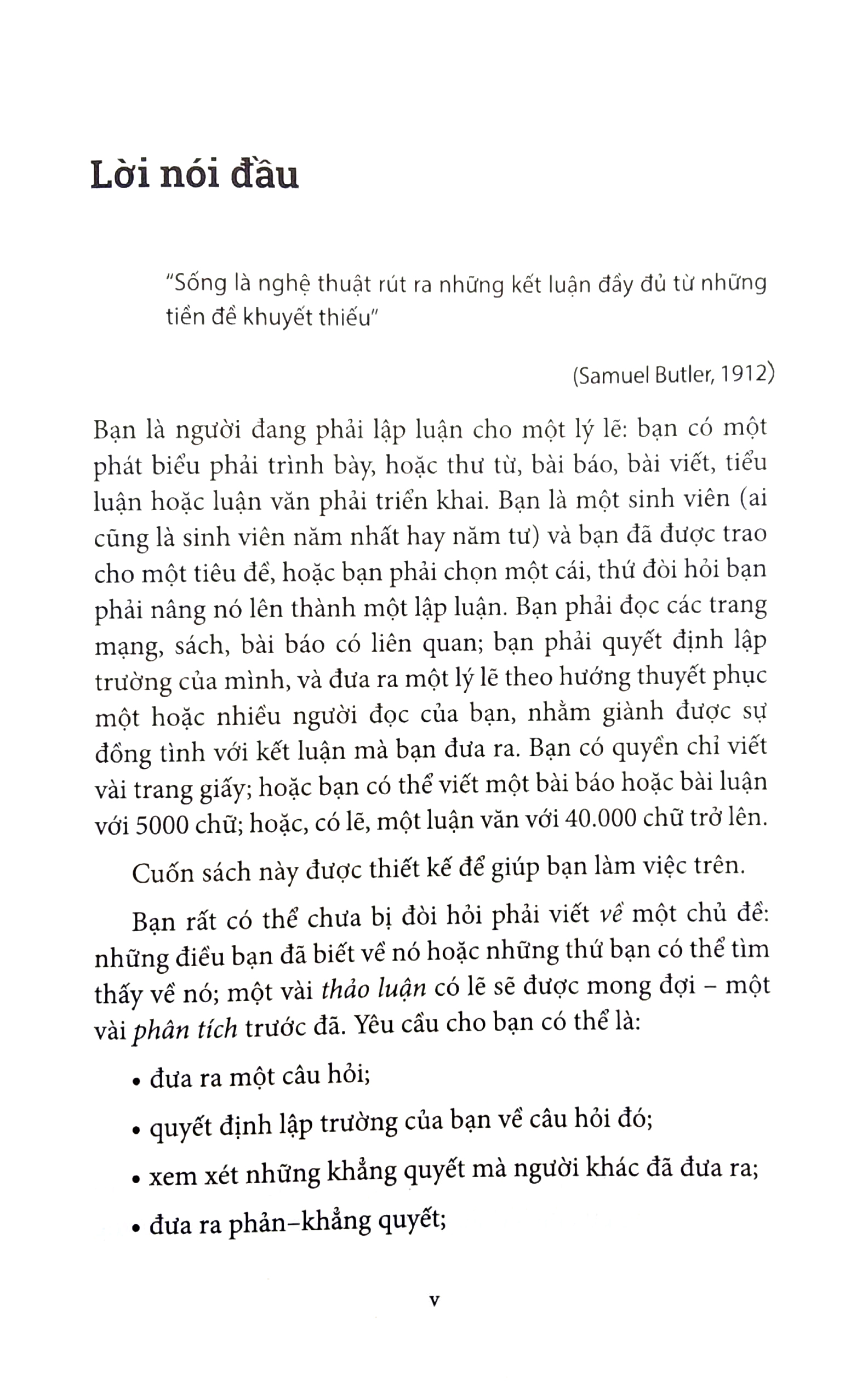 Quyển sách dễ tiếp cận này đưa bạn từng bước từng bước vào nghệ thuật lập luận, từ suy tư về viết cái gì và viết làm sao, cho đến làm cách nào có thể củng cố các khẳng quyết của bạn, và làm sao đi đến một kết luận vững chắc. Được viết một cách hấp dẫn cùng với các tóm tắt đặc biệt hữu ích ở cuối mỗi chương, quyển sách này cho ta lời khuyên dễ dàng thực hiện theo khi đánh giá lập luận của những người khác và trình bày những lập luận hiệu quả của chính bạn. Điểm mạnh của quyển sách này nằm ở hướng dẫn dễ hiểu và sử dụng các lập luận có thực trong đời – vừa đương đại vừa trong lịch sử - và những câu hỏi có thực trong tiểu luận từ đủ các ngành khoa học xã hội và nhân văn. Những ví dụ hấp dẫn, có liên quan, và thường vui vẻ, được sử dụng không phải để minh họa, nhưng để đưa ra các điểm tinh túy ta có thể học, kỹ thuật nào có thể vay mượn và những cạm bẫy cần tránh trong lĩnh vực tư duy phân tích và viết lách.