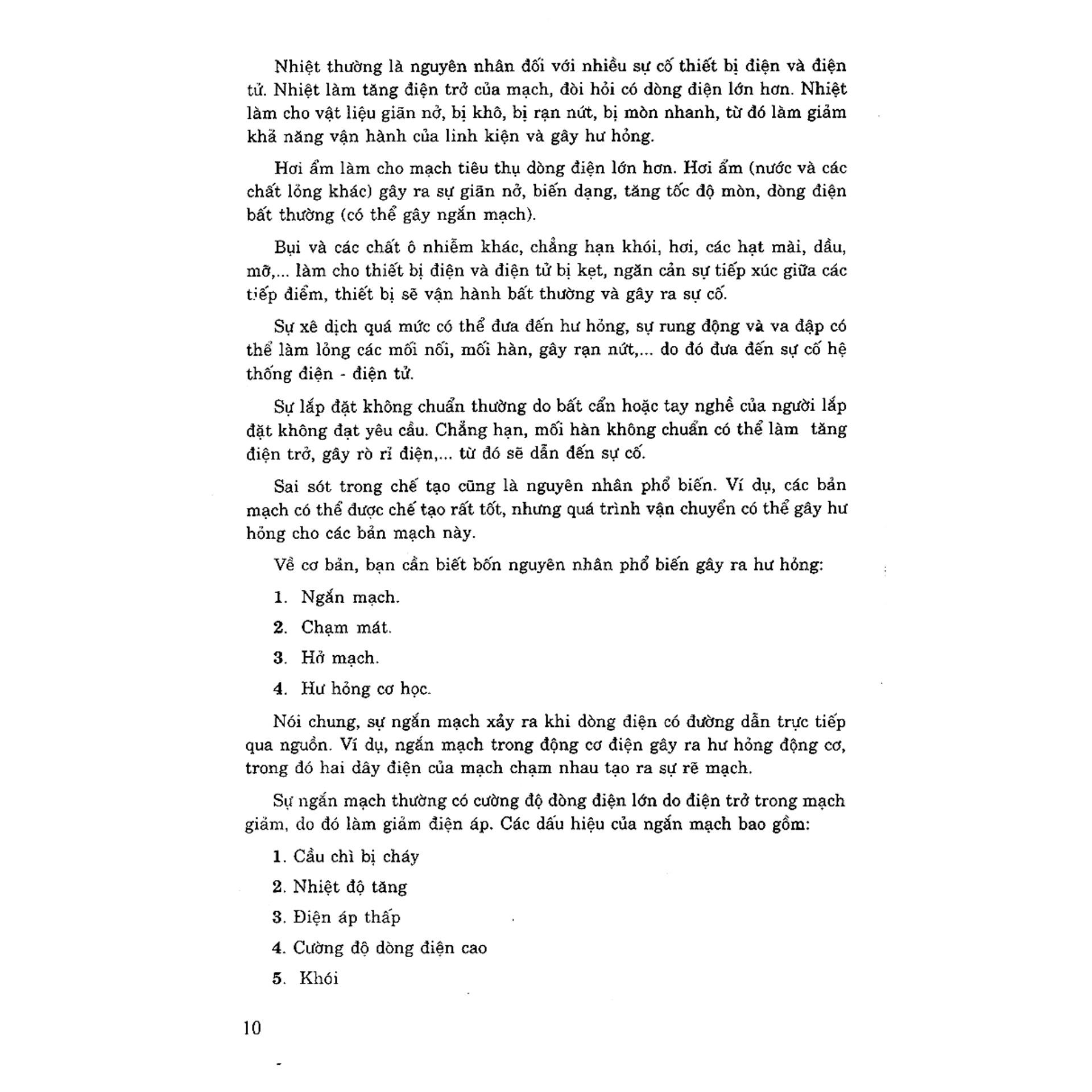 Chương 10 khái quát các thiết bị y sinh học. Các nguyên lý, ứng dụng, các qui trình chẩn đoán để sửa chữa và chuẩn hoá thiết bị chẩn đoán và trị liệu y khoa, chẳng hạn máy điện tâm đồ, các máy x-quang, các máy quét CT và MRI, máy siêu âm… Cuối sách là phụ lục, trình bày tóm tắt các bước chẩn đoán và xử lý sự cố các trang thiết bị về điện và điện tử đã được đề cập trong nội dung cuốn sách. Đây là tài liệu bổ ích cho những người quan tâm đến lĩnh vực điện và điện tử.
