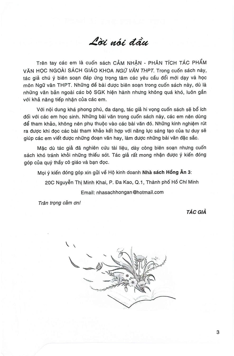 Trên tay các em là cuốn sách CẢM NHẬN - PHÂN TÍCH TÁC PHẨM VĂN HỌC NGOÀI SÁCH GIÁO KHOA NGỮ VĂN THPT. Trong cuốn sách này, tác giả chú ý biên soạn đáp ứng trọng tâm các yêu cầu đổi mới dạy và học môn Ngữ văn THPT. Những đề bài được biên soạn trong cuốn sách này, dù là những văn bản ngoài các bộ SGK hiện hành nhưng không quá khó, luôn gắn với khả năng tiếp nhận của các em.