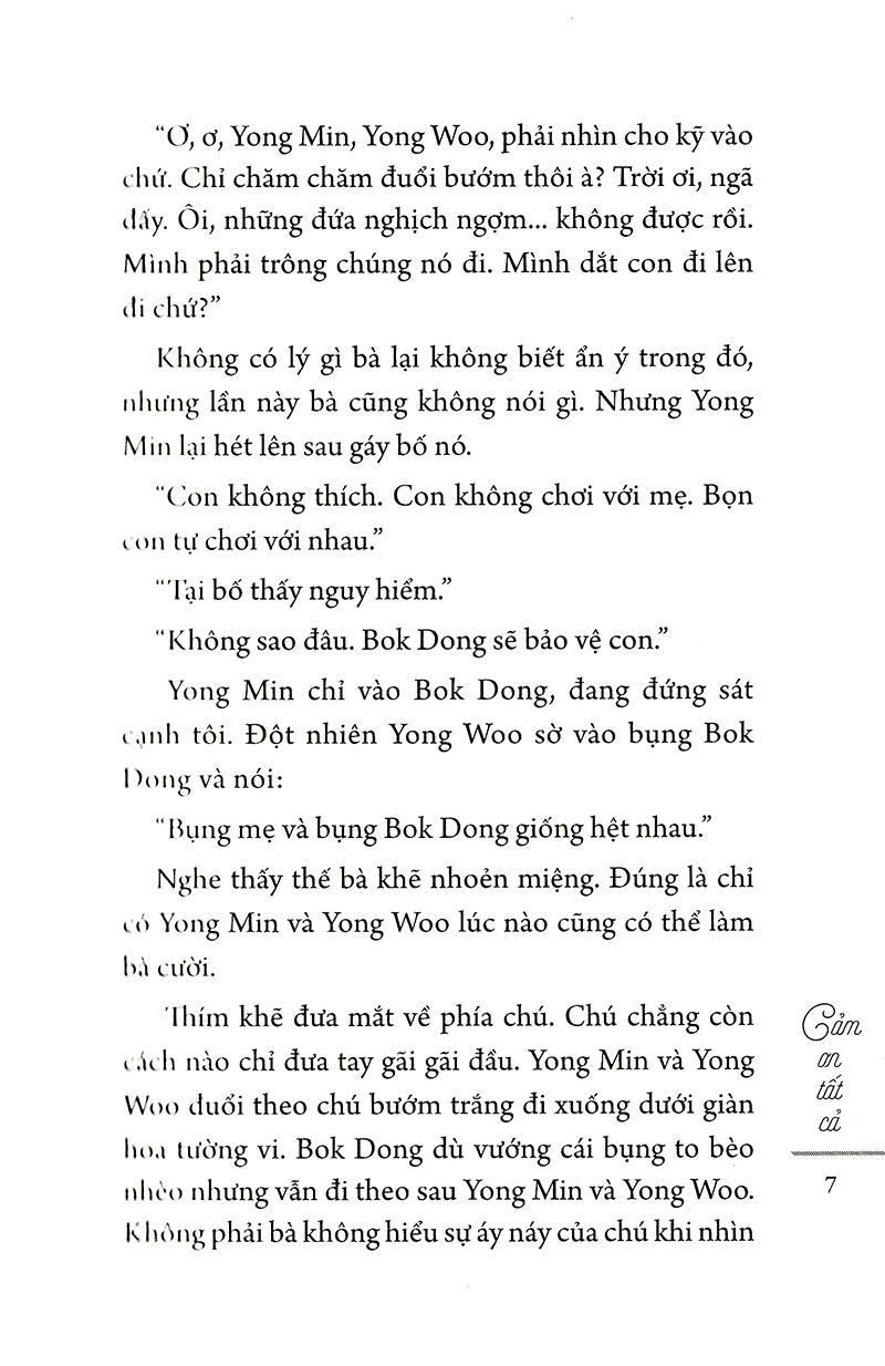 “Những con người trong Cảm ơn tất cả dù lớn hay nhỏ đều có sự khó khăn, nghèo khổ. Sự nghèo khổ đó đã trở thành động lực gắn kết mọi người, sự yêu thương đùm bọc lẫn nhau biến thành sức mạnh. Người giúp tôi nhận biết sức mạnh nghèo khổ đó chính là những thanh thiếu niên tôi gặp trong làng, gặp ở trường và gặp ở phòng tự học. Những bạn trẻ tự chữa lành vết thương cho mình và cuộc sống hiện tại “bây giờ, tại nơi này” của họ… Khi viết Lời tác giả tôi muốn chuyển tới Yu Jung, Kwang Su, Woo Ju, Ji Hee, những nhân vật tôi tưởng chừng như vẫn sống đâu đây, một lời: “Cảm ơn.” Tôi cũng muốn gửi lời cảm ơn tới tất cả những người bạn nhỏ của tôi: “Cảm ơn tất cả.” - Kim Jung-mi