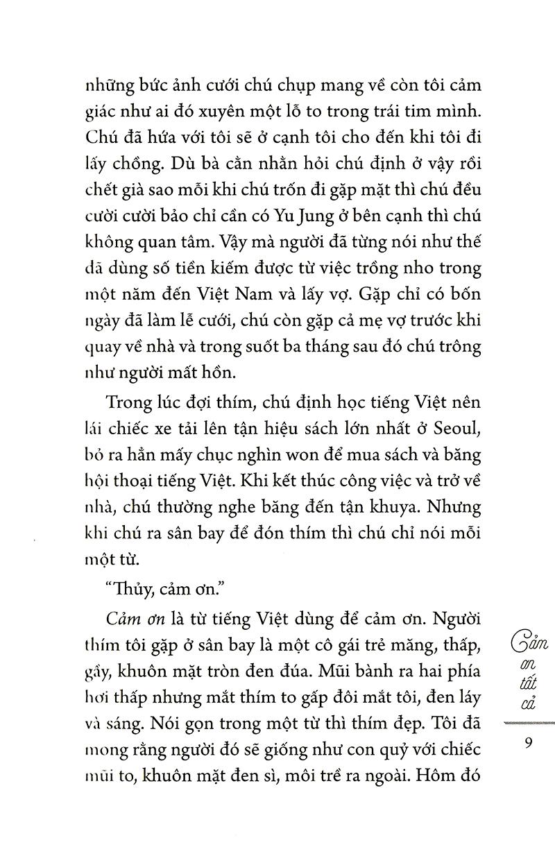 Cũng trong Cảm ơn tất cả có hình ảnh khá rõ nét của một phụ nữ Việt Nam – Thủy, người thím của Yu Jung. Thủy 20 tuổi kết hôn với người chồng khác quốc tịch 37 tuổi từ ngay lần gặp đầu tiên nhưng cuộc hôn nhân của cô khá hạnh phúc. Cô và chồng yêu thương nhau, có 3 mặt con và hòa nhập tốt với cuộc sống mới. Cô xuất hiện từ trang đầu tiên của tác phẩm trong cái nhìn hơi khe khắt ác cảm của bà mẹ chồng và cô cháu gái và cũng xuất hiện ở những dòng cuối cùng với hình ảnh gần gũi, thân thương: “Khi tôi vừa ngồi xuống ghế thì nhận được tin nhắn. Là tin nhắn của thím. “Cháu không bị lỡ xe đấy chứ? Nữ sinh cấp 3 Yu Jung, học chăm chỉ nhé! Yêu cháu!” Tôi trả lời tin nhắn của thím. “Thím, cảm ơn. Cháu yêu thím ♡”