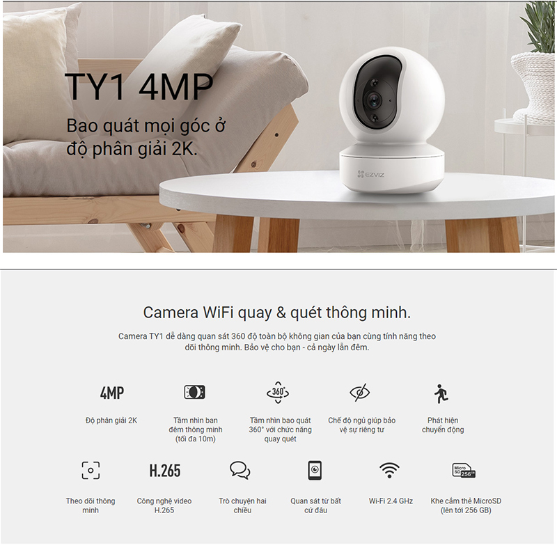 Camera wifi Ezviz TY1- 4MP siêu nét, quay quét 360 độ, đàm thoại 2 chiều