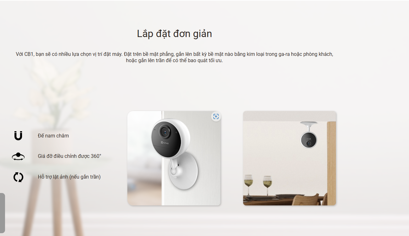Thiết kế nhỏ gọn và tinh tế: Một chân đế gắn nam châm và bộ gắn thông minh giúp việc lắp đặt trở nên dễ dàng. Lắp camera này bằng cách gắn vào bất kỳ bề mặt từ tính nào hoặc sử dụng bộ dụng cụ để lắp vào tường hoặc trần nhà - và thế là bạn đã sẵn sàng. Thân định vị được nâng cấp trên chân đế giúp camera linh hoạt hơn, điều chỉnh góc quan sát chính xác hơn.