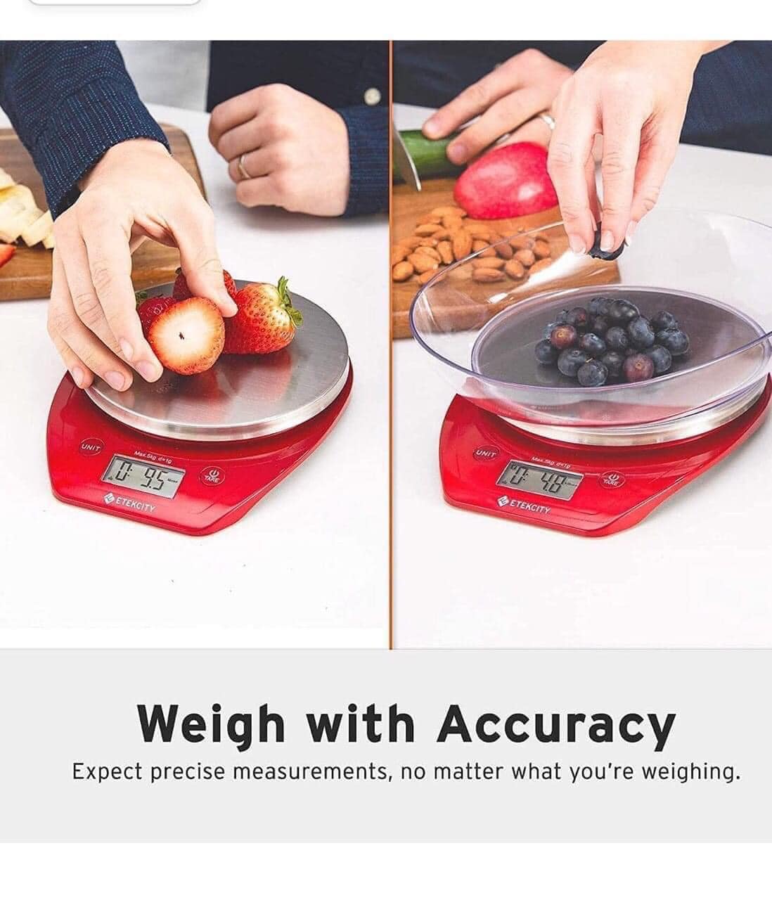 thảm chống trượt, chiếc cân nhà bếp này mang đến trải nghiệm chính xác. Dung tích 5 kg với độ chia 0,1 oz / 1 g. THIẾT KẾ HIỆN ĐẠI: Vẻ ngoài màu đỏ nổi
