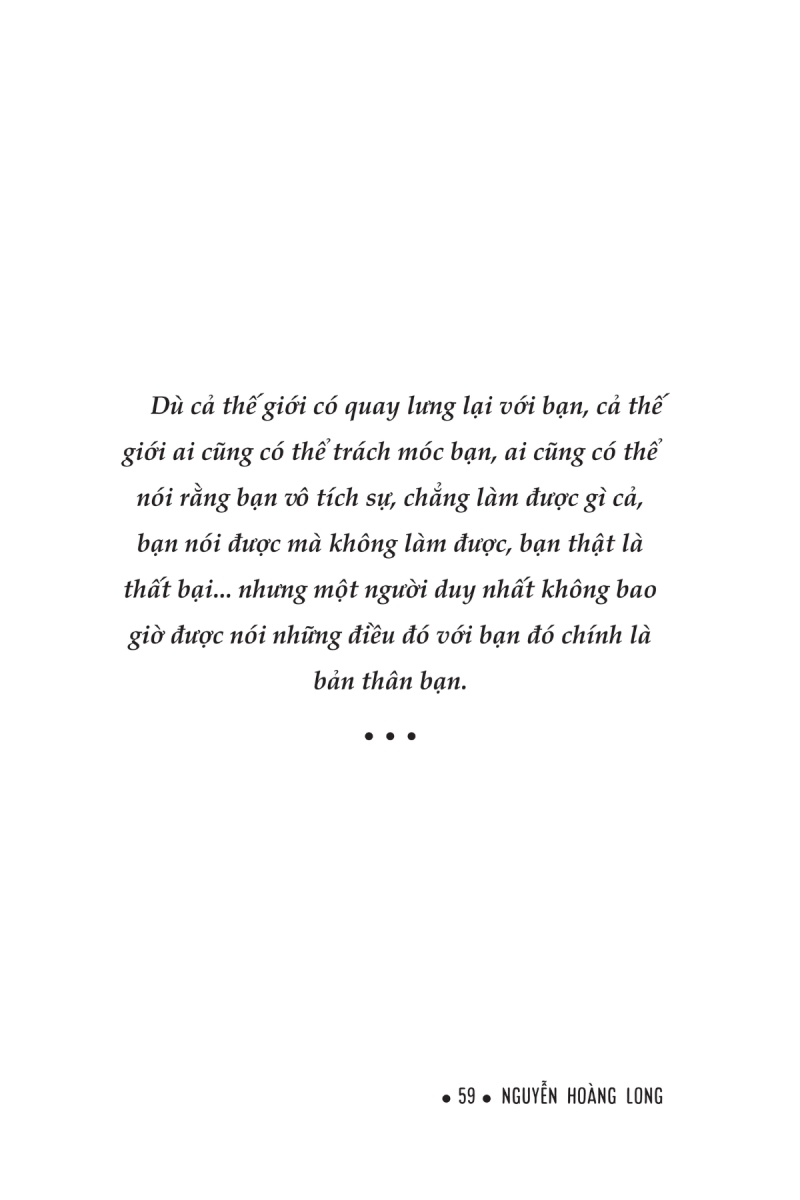 Mình Phải Sống Thật Trọn Vẹn Mỗi Ngày ------------   BE YOURSELF. Hãy là chính mình. Tôi đã từng không mảy may nghi ngờ và hoàn toàn đồng ý, khẳng định một cách vô điều kiện về câu nói này. Tôi nghĩ rằng không thay đổi bản thân theo tiêu chuẩn của thế gian, không quan tâm đến cái nhìn của người khác và sống đúng với con người thật của mình chính là cách sống tuyệt vời nhất. Thế nhưng cuộc đời vốn dĩ chẳng hề đơn giản như vậy. Nhiều năm qua, tôi đã luôn đau đáu câu hỏi sống với con người thật của mình là sống như thế nào, và tôi nhận ra rằng trong đó có biết bao yếu tố phức tạp đan xen. Tôi đã không còn có thể định nghĩa một cách đơn giản rằng sống là chính mình là sống như mình muốn, theo cảm xúc và nhu cầu của bản thân, theo phong cách và hoài bão của riêng mình nữa. Cuộc sống là quá trình tiếp nhận những thử thách bên ngoài, đau đáu suy nghĩ và giác ngộ để rồi gọt giũa bản thân. Tôi cũng nhận ra một sự thật rằng cuộc đời này rất cần dũng khí để có thể áp dụng định nghĩa “sống là chính mình” theo cách mới mẻ. Trong những khoảng thời gian vừa bất an vừa mãn nguyện, vừa lo sợ vừa háo hức, tôi đã cố gắng tìm ra một cách sống thật sự phù hợp với bản thân mình. Tôi đã có thể đối diện với những cảm xúc phức tạp, có cả tự hào, thất vọng, đan xen tham vọng về bản thân và từ bây giờ tôi đã sẵn sàng chấp nhận sự thay đổi, tôi sẽ là chủ nhân rộng lương hơn và bao dung hơn với chính mình. Tôi sẽ sống thật trọn vẹn mỗi ngày cho đến khi rời khỏi thế gian này. Trích dẫn hay trong sách: - “Tuy có đau đớn nhưng chúng ta vẫn phải tiến về phía trước. Bản thân với sống với những nỗi nhớ về quá khứ đã qua và mơ về tương lai sắp tới chính là sự tiến bước.” - “Dưới bầu trời này, không có gì mãi luôn mới mẻ nhưng lại luôn có những cách nhìn mới mẻ về những điều đã cũ.” - “Không có quy tắc nào buộc ta phải luôn đi thẳng. Đôi khi đi vòng tròn, đi từ phải sang trái, đôi lúc là chấm ra điểm xuất phát mới, thỉnh thoảng ta cũng có thể vẽ ra đường chéo để đi theo, đó chính là cuộc đời.”