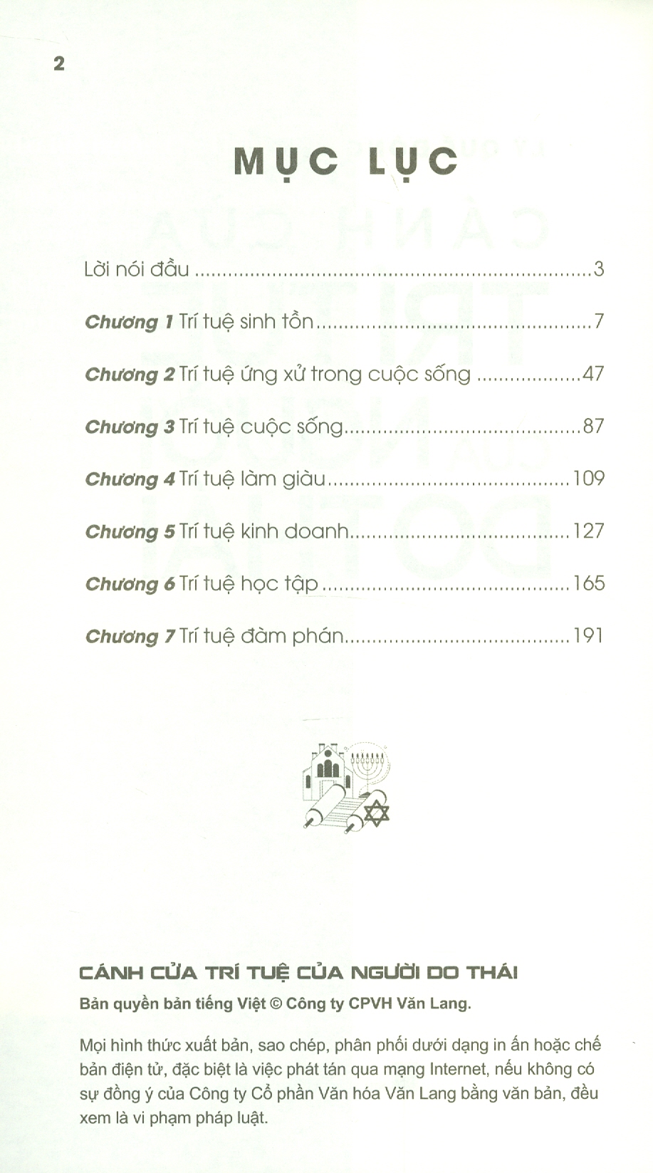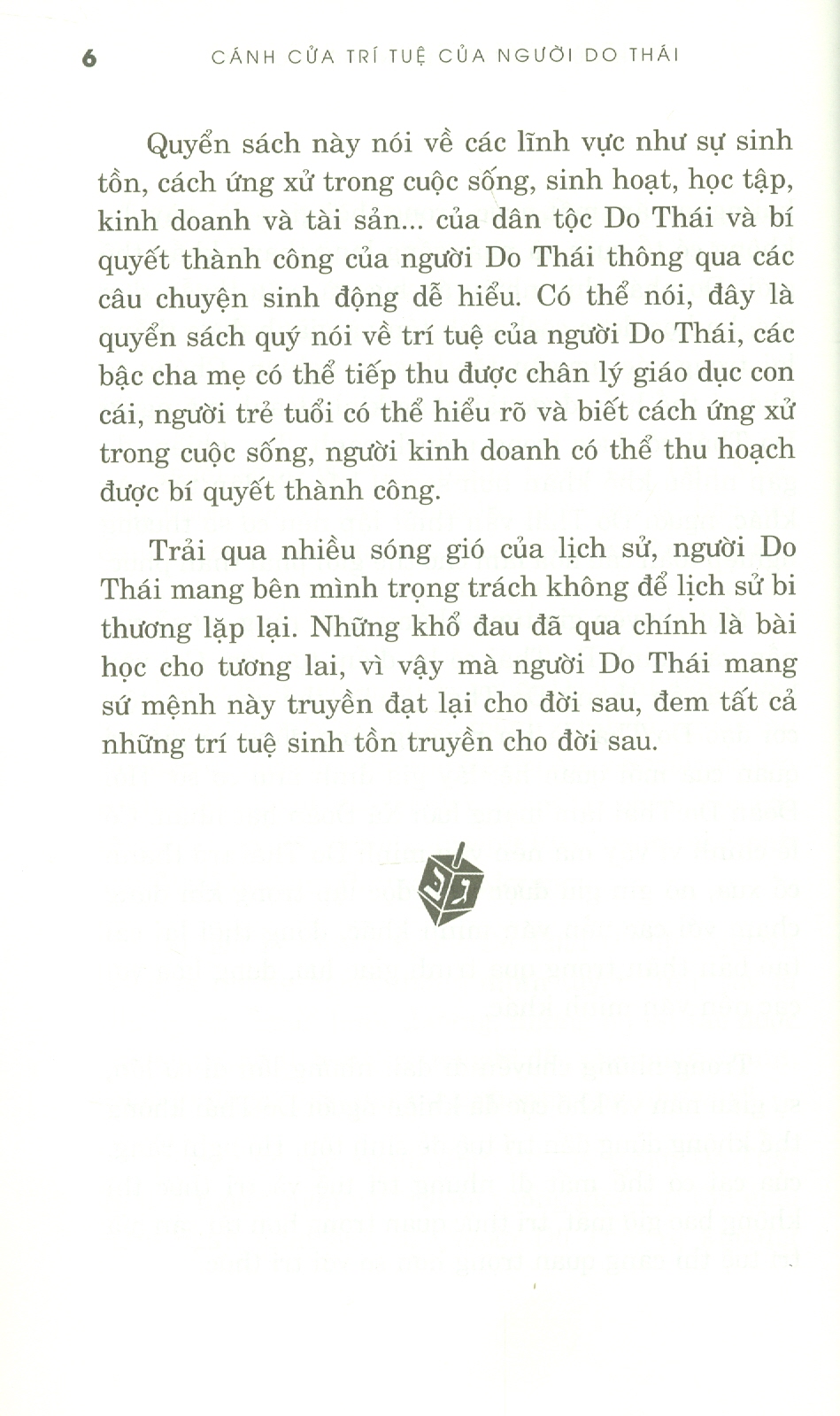 Đấu tranh sinh tồn, cách ứng xử trong cuộc sống, sinh hoạt, học tập, kinh doanh của dân tộc Do Thái chính là những bí quyết đưa đến thành công mà bạn đọc có thể tìm thấy trong Cánh cửa trí tuệ của người Do Thái. Đó là những kinh nghiệm sống thiết thực, vô cùng hữu ích đối với chúng ta: từ phương pháp giáo dục con cái, cách ứng xử trong cuộc sống, cho đến bí quyết kinh doanh thành đạt… Tất cả đều là những chiếc chìa khóa thần kỳ mở ra cánh cửa của tri thức và niềm tin khi bước vào cuộc sống.