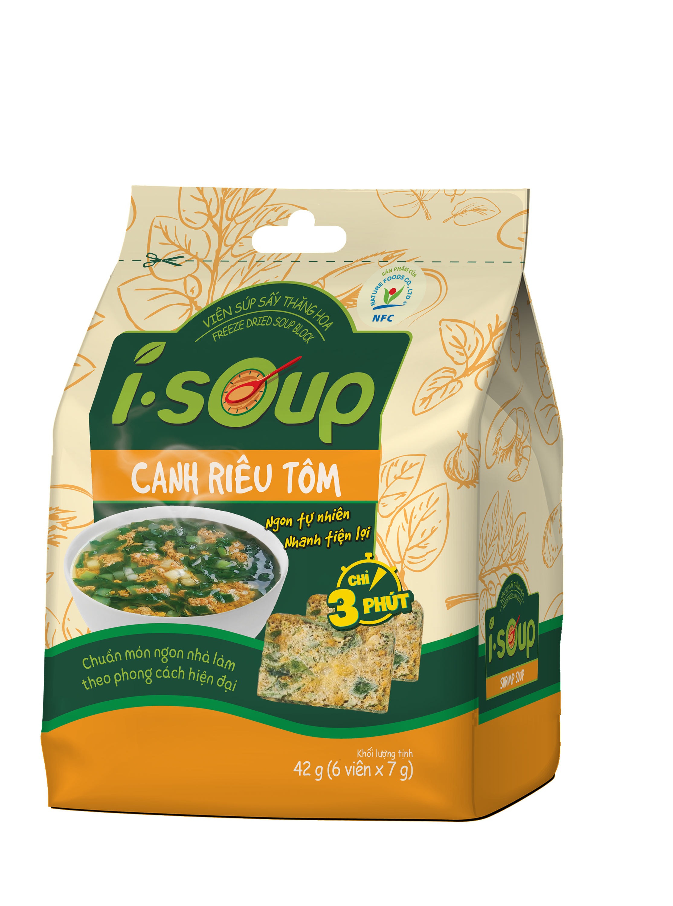 - Canh riêu tôm ăn liền I-Soup 42g ( túi 06 viên) - Viên Súp Chay Sấy Thăng Hoa thơm ngon hấp dẫn, dạng viên nén nhỏ gọn tiện lợi. I-SOUP cho bạn tô canh ngon lành dinh dưỡng chuẩn món ngon nhà làm chỉ sau 3 phút, cho gia đình bạn bữa ăn ngon đặc biệt phù hợp cho những ngày bận rộn.