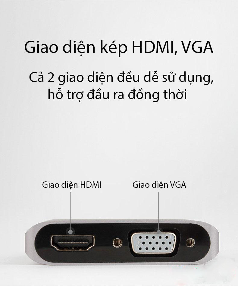 Giao diện kép kết nối đồng thời: Hỗ trợ xuất ra hai cổng HDMI và VGA có thể xuất cả 2 cổng cùng 1 lúc với độ phân giải full HD 1080