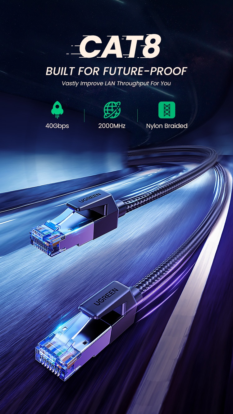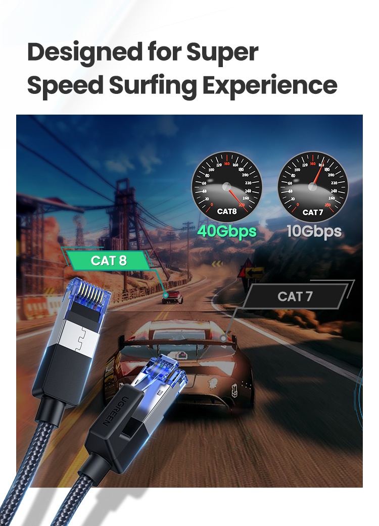 Tốc độ mạng cáp Cat8 đúc sẵn bọc dù dài 20M Ugreen 30800 hỗ trợ chuẩn BASE-T 40Gbps và tốc độ mạng nhanh hơn nhiều so với cáp Cat7 tiêu chuẩn hỗ trợ 10Gbps.