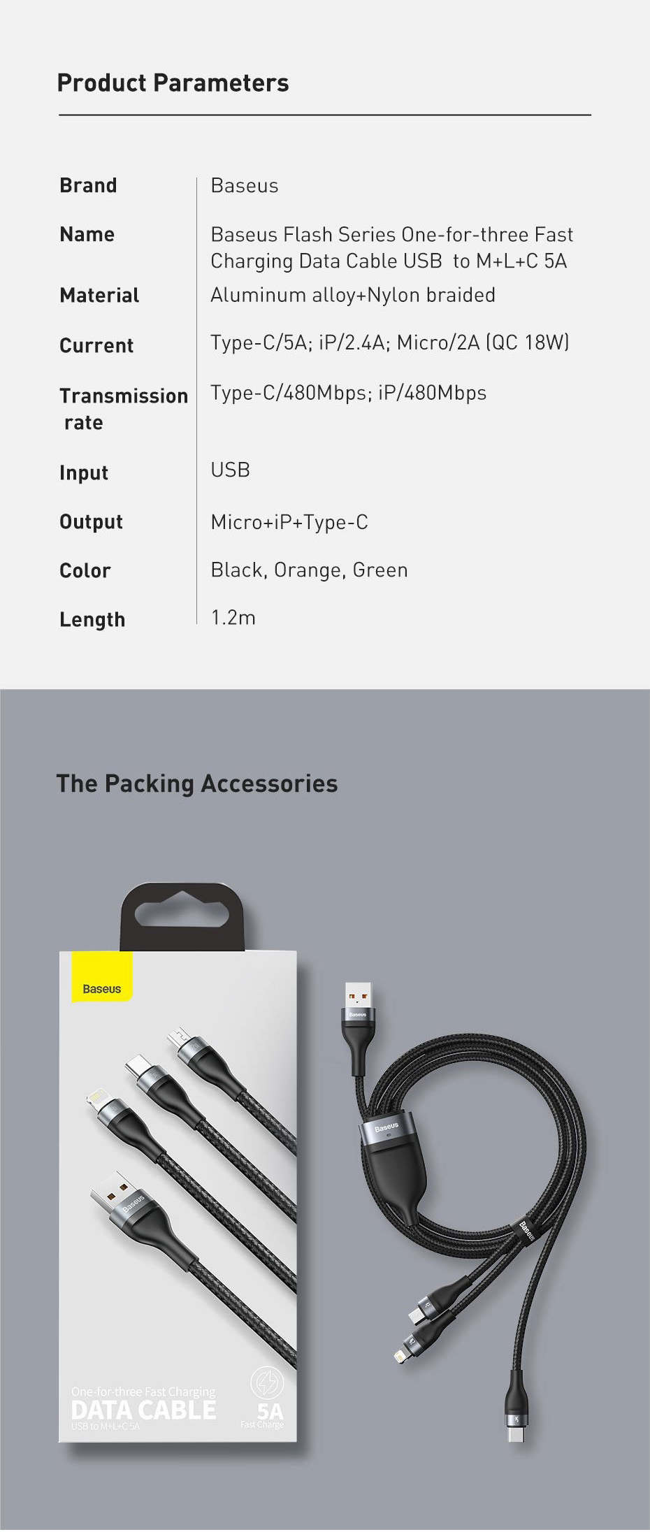 • Cáp sạc nhanh 3 đầu Baseus Flash Series 3in1 là thế hệ cáp sạc đa năng mới nhất của Baseus với tính năng hỗ trợ sạc nhanh(Quick charge) giúp sạc nhanh các thiết bị so với các loại cáp khác.